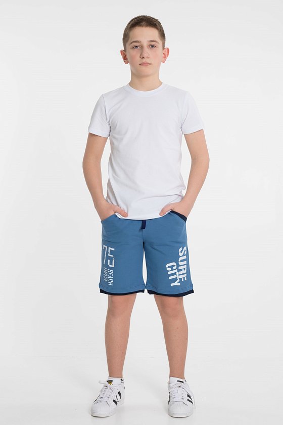 Шорты детские выполнены из футер петли. Пояс на резинке, через люверсы продёрнут шнур. По бокам расположены карманы. Спереди нанесён принт.