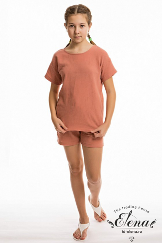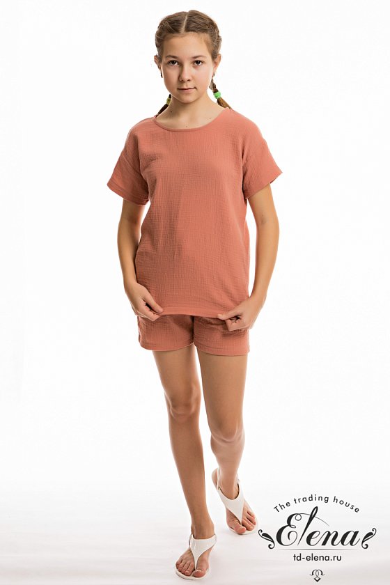 Шорты из однотонного муслина. Короткие, с боковыми карманами. Пояс притачной, на резине и шнуре.