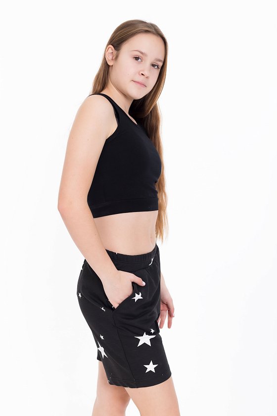 Шорты для девочки из футера с лайкрой черного цвета с набивным рисунком звезды - стильно и удобно. Слегка расширенный крой придает шортам комфорт и свободу движений. Боковые карманы добавляют практичности и удобства, позволяя хранить мелочи или просто расслабить руки. Притачной пояс обеспечивает комфортную посадку, а наличие лайкры в составе ткани обеспечит эластичность и легкость в движении. Набивной рисунок звезды придает шортам интересный и яркий вид.