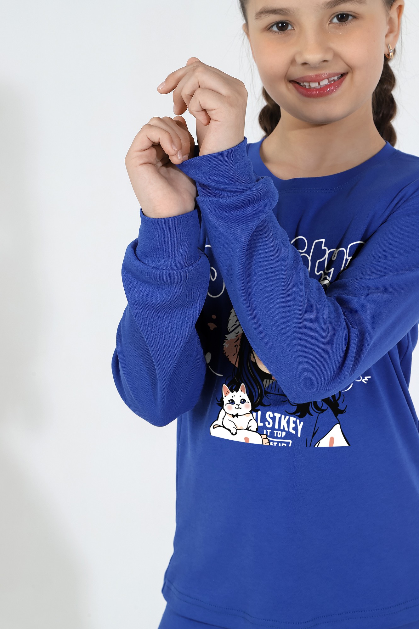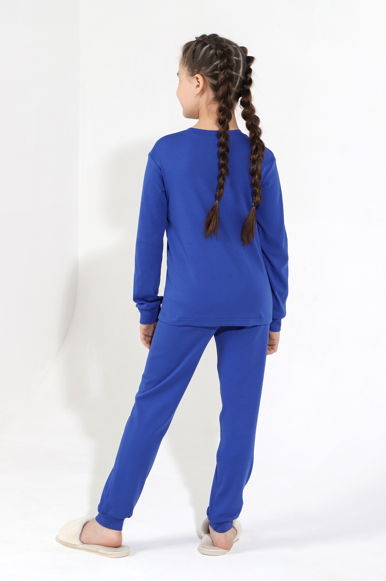 Пижама из интерлока для девочки, состоящая из джемпера и брюк. Джемпер со слегка спущенной линией плеч, с принтом на переде. Низ рукавов и брючек на манжетах.