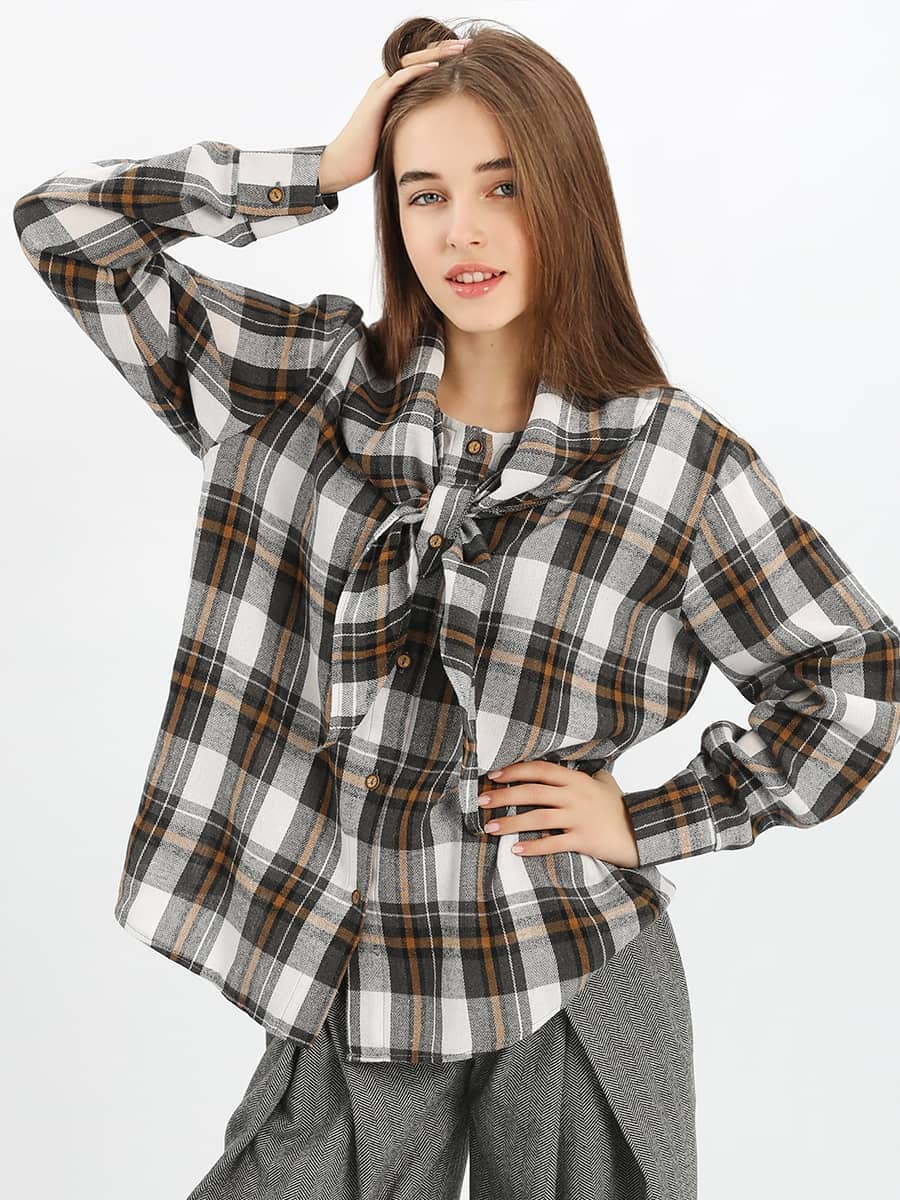 Блузка для девочки Соль&Перец с воротником-шалька. Блузка выполнена из мягкой фланелевой ткани, которая обеспечивает комфорт в прохладную погоду и позволяет коже дышать. Это универсальная и комфортная одежда, сочетающая теплоту, практичность и стильный дизайн.