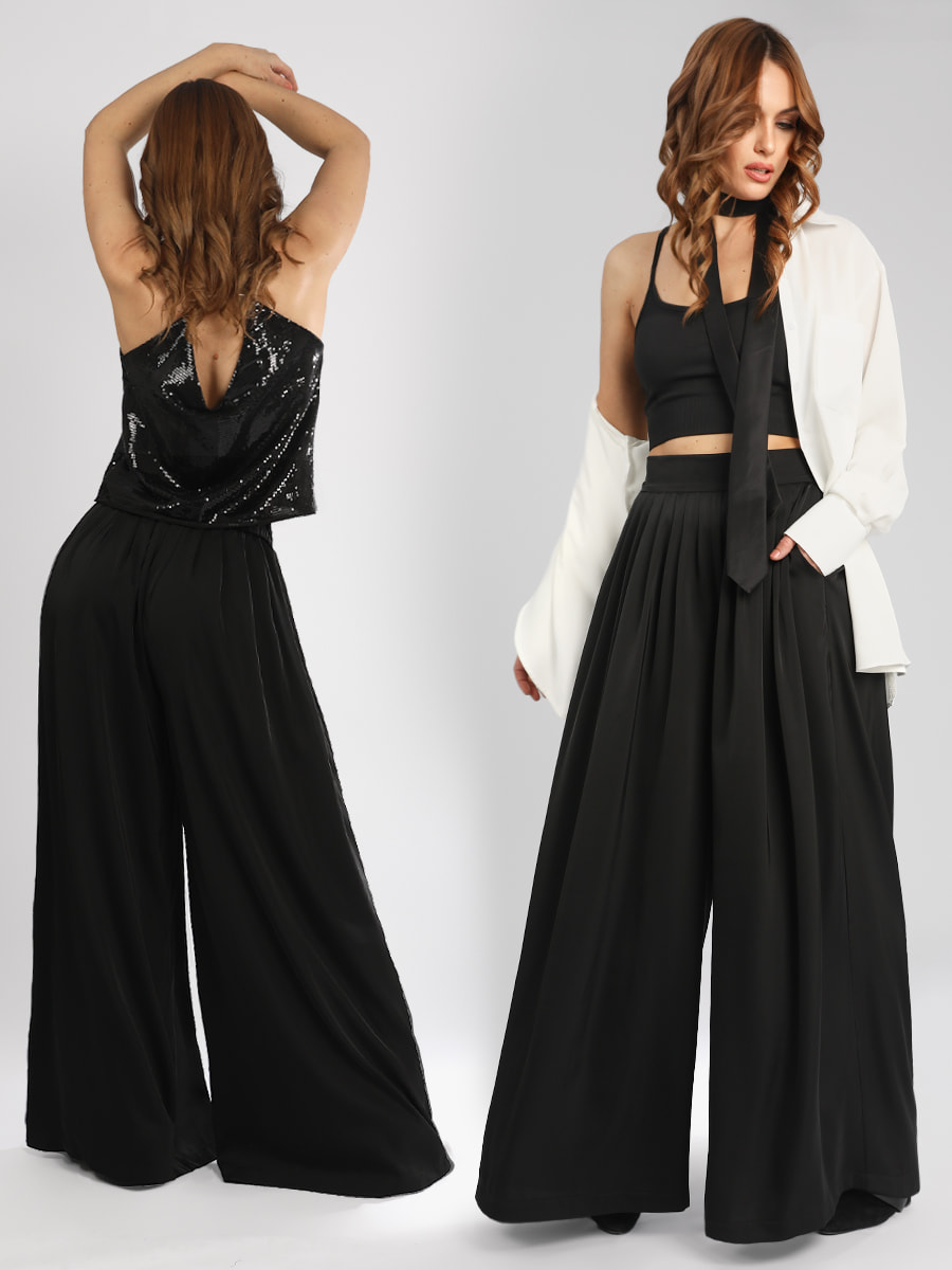 Элегантные шелковые брюки-палаццо Соль&Перец. Модель представляет собой изысканные женские брюки свободного кроя с характерным расширением к низу. Брюки на молнии, с высокой посадкой, с карманами по бокам, пояс на эластичной резинке сзади для комфортной посадки. Брюки прекрасно сочетаются с любым верхом, и подойдут для любого мероприятия, подчеркнут Ваш индивидуальный стиль.