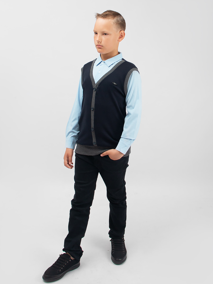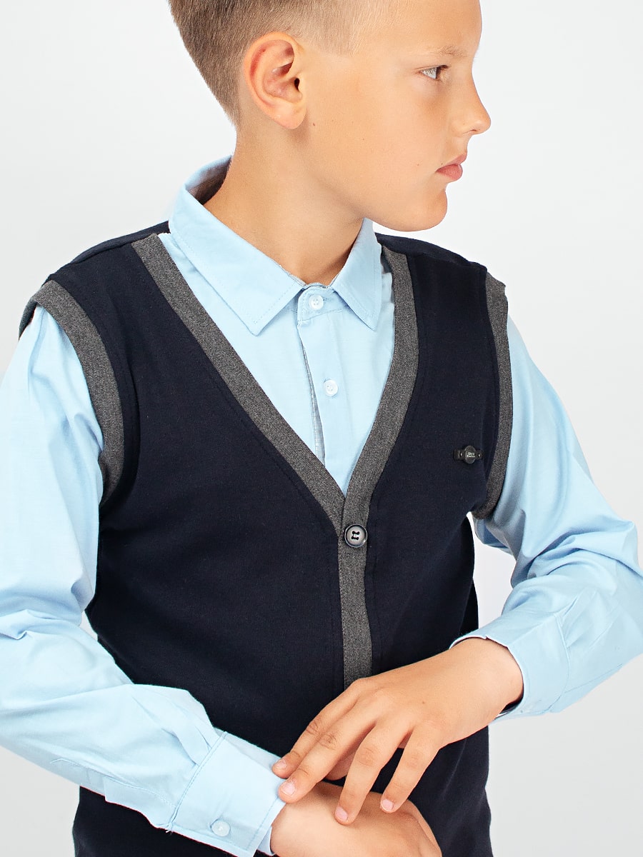 Джемпер-обманка с имитацией рубашки. Жилет с V-образным вырезом, выполнен из мягкого, приятного к телу трикотажа. По низу изделия - манжет. Имитация рубашки так же выполнена из натурального материала, на груди застегивается на две пуговицы. Идеальный выбор для создания классического школьного образа.