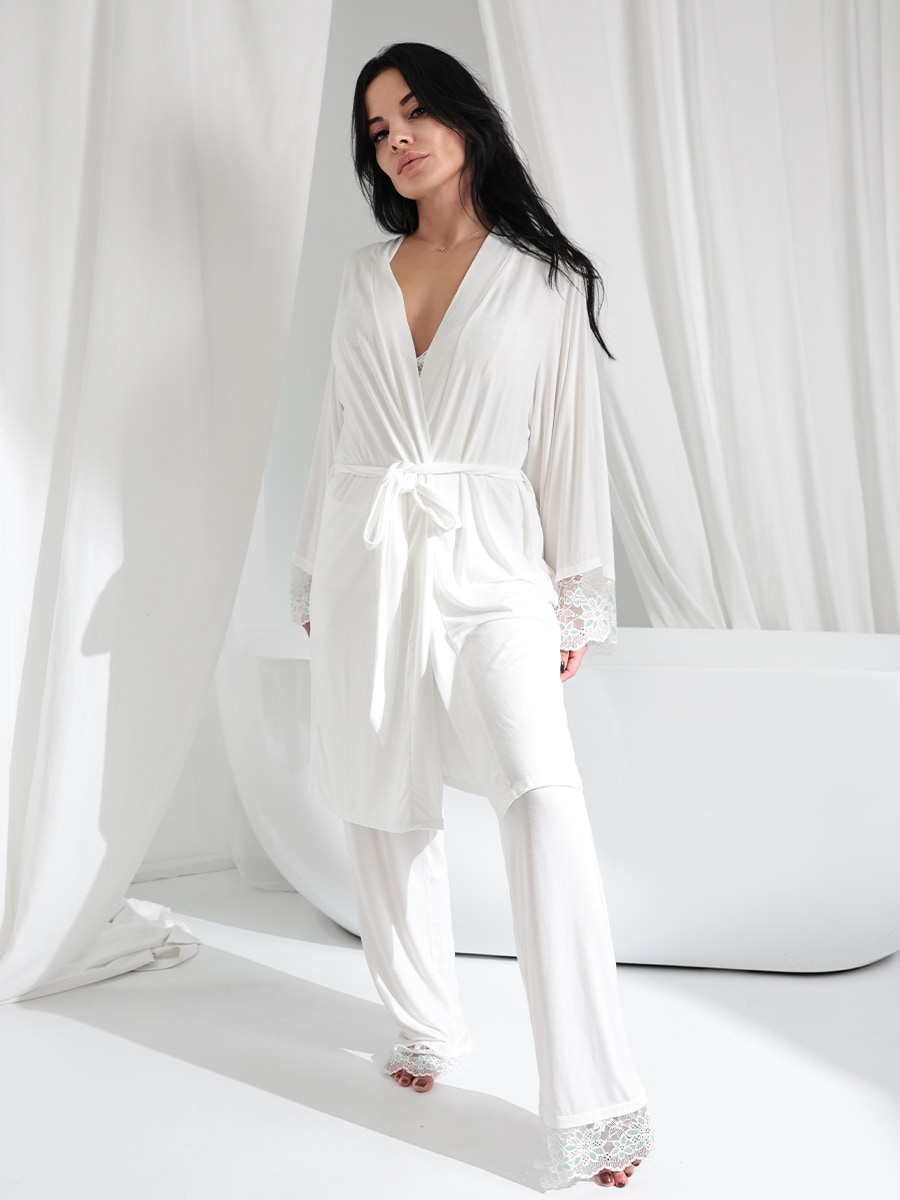 Элегантный женский халат из модала. Модал, современный экологичный текстиль с шелковистой текстурой, обладает высокой прочностью и износостойкостью, отлично пропускает воздух, позволяя коже дышать, не электризуется и не вызывает аллергических реакций. Регулируемые завязки позволяют корректировать силуэт, съёмный пояс добавляет модели универсальности, рукава 3/4 с кружевными манжетами добавляют изысканности. Универсальный дизайн подходит для повседневной носки и особых случаев. В комплекте сумка-мешочек для хранения.