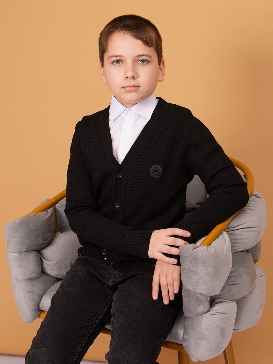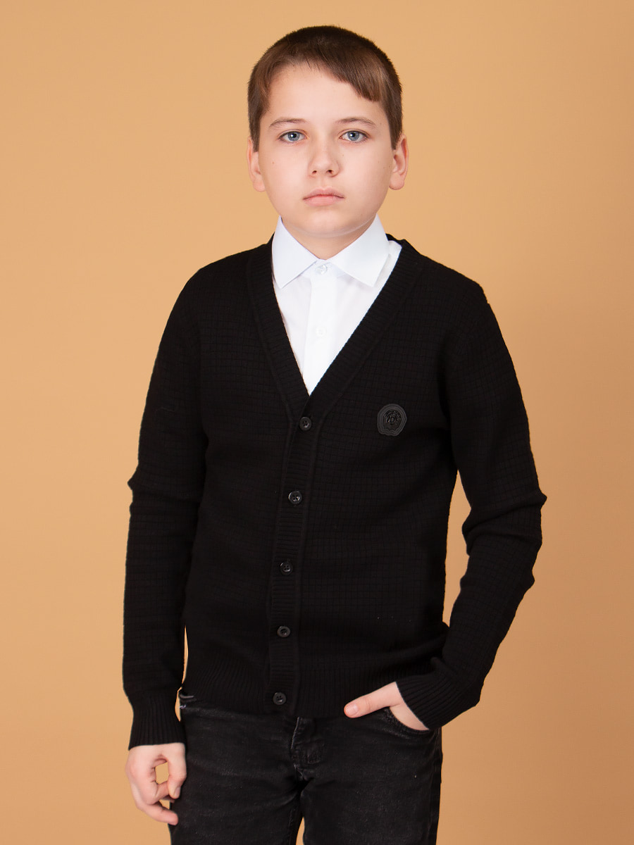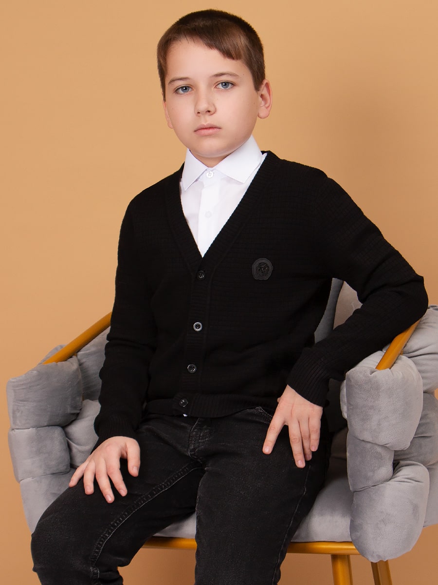 Стильный, трикотажный кардиган на пуговицах для мальчика. Мягкий, вязаный трикотаж не сковывает движений, обладает хорошей воздухопроницаемостью и приятно облегает тело. Прекрасно вольется как в повседневный, так и в школьный гардероб.