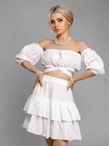 Костюм летний Соль&Перец, состоит из топа и юбки, выполнен из нежного двухслойного муслина, который создаёт лёгкую и воздушную текстуру. Топ украшен декоративным цветком из основной ткани. Модель с завязками, позволяющими регулировать посадку и создавать различные силуэты. Юбка выполнена из воланов, что придаёт ей объём и динамику. По талии юбка на широкой, эластичной резинке, обеспечивающей комфортную посадку и свободу движений. Этот комплект идеально подойдёт для летних прогулок, пляжного отдыха и повседневных образов, сочетая в себе элегантность и удобство.