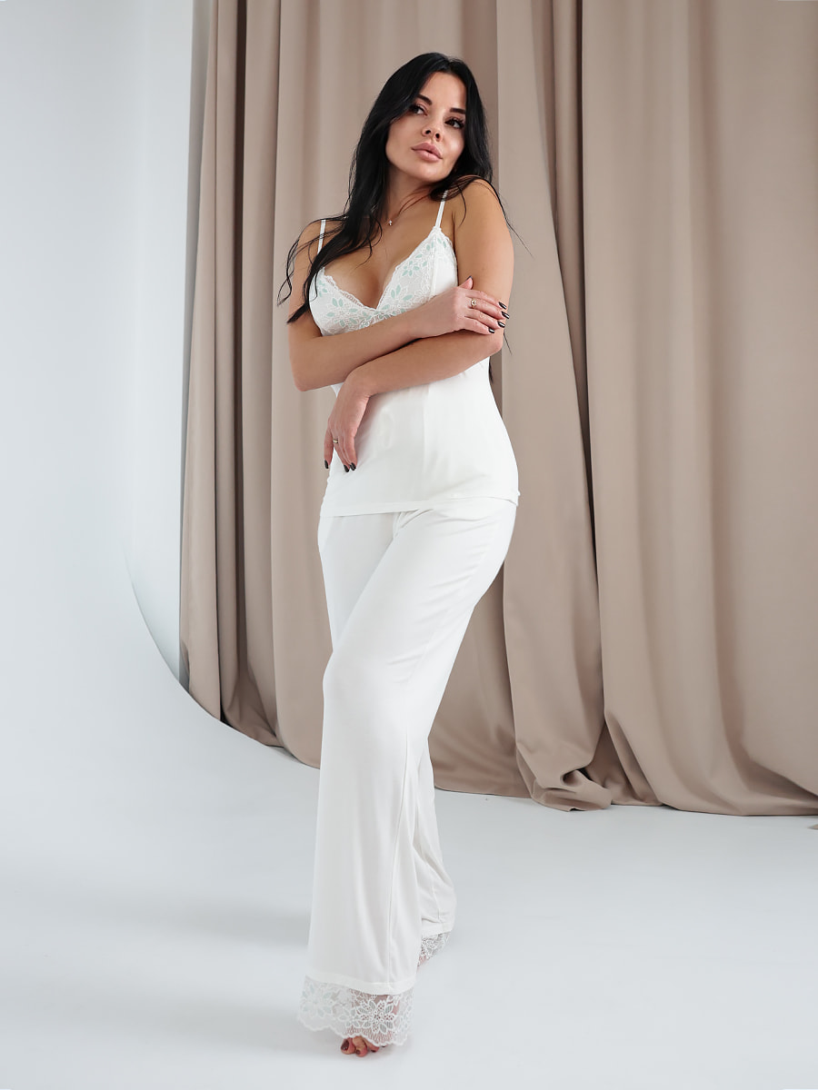 Пижама женская (майка и брюки) Соль&Перец выполнена из высококачественного модала, который обеспечивает отличную воздухопроницаемость, не вызывает аллергических реакций, с шелковистой текстурой и приятный к телу. Майка с тонкими, регулируемыми бретелями и кружевной отделкой. Брюки с карманами, с широкой, эластичной резинкой со шнурком, и также с кружевной отделкой. Такой домашний костюм станет идеальным выбором для отдыха, домашних дел и уютных вечеров. В комплекте сумка-мешочек для хранения.