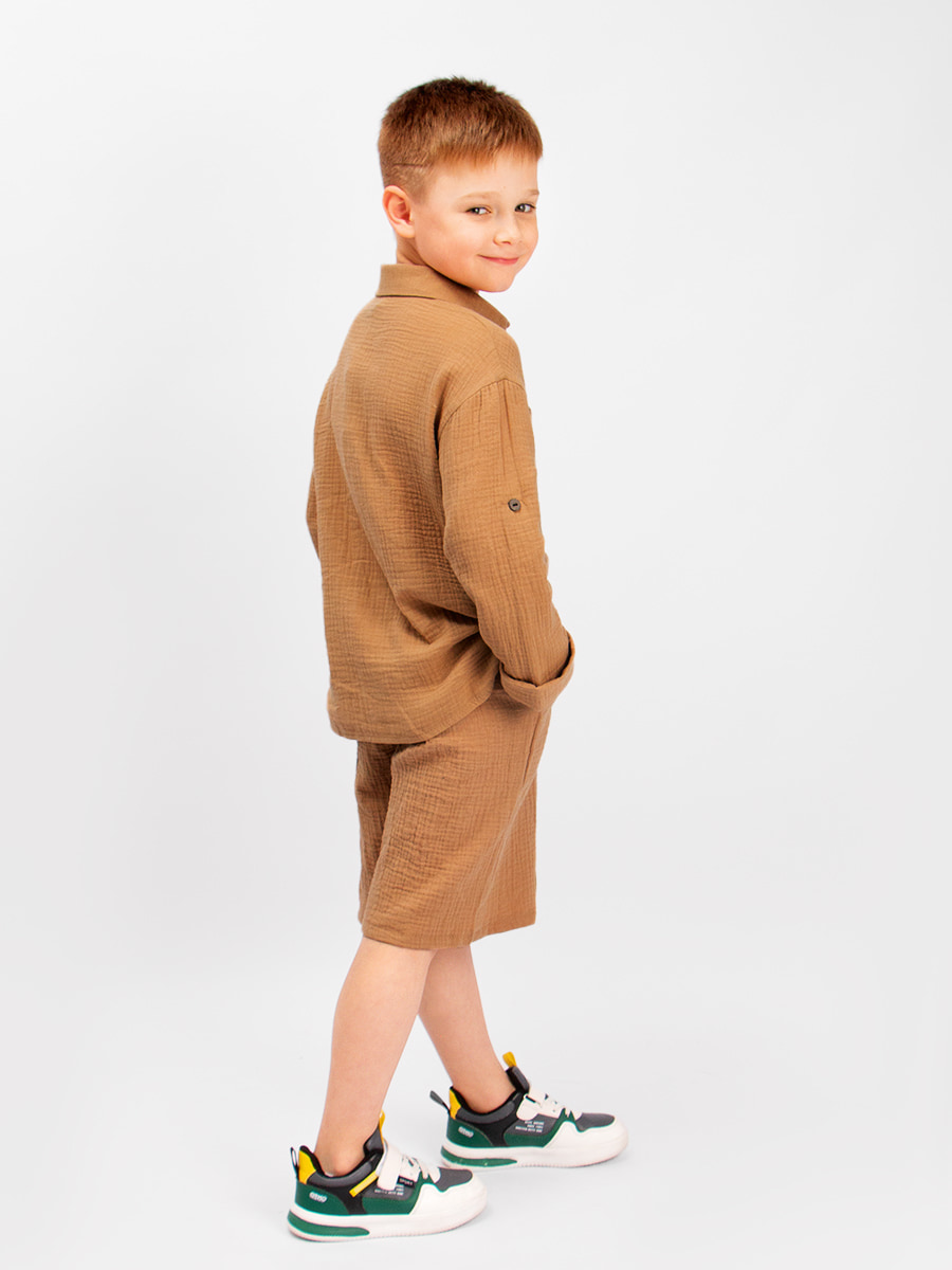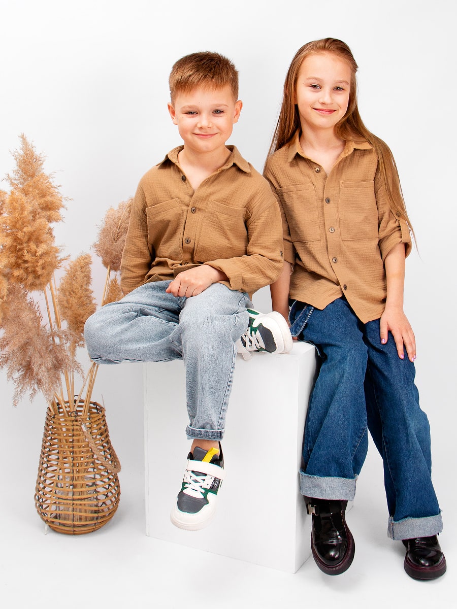 Стильная, детская, подростковая рубашка Соль&Перец свободного кроя. Рукава можно зафиксировать с помощью паты и пуговицы из кокоса. Модель рубашки с накладными карманами. Ткань-двухслойный муслин, хорошо пропускает воздух, защищает от солнца, идеально подходит для чувствительной кожи.