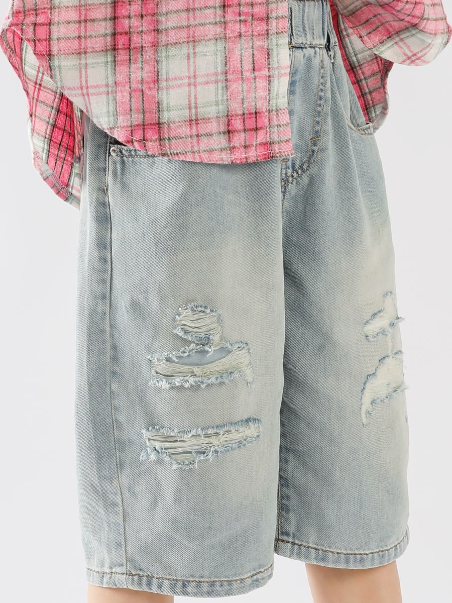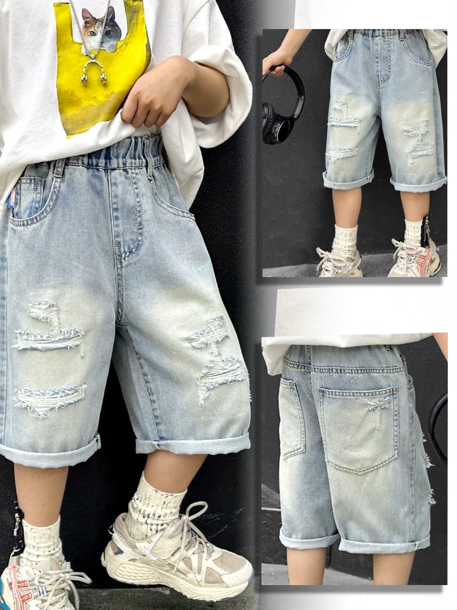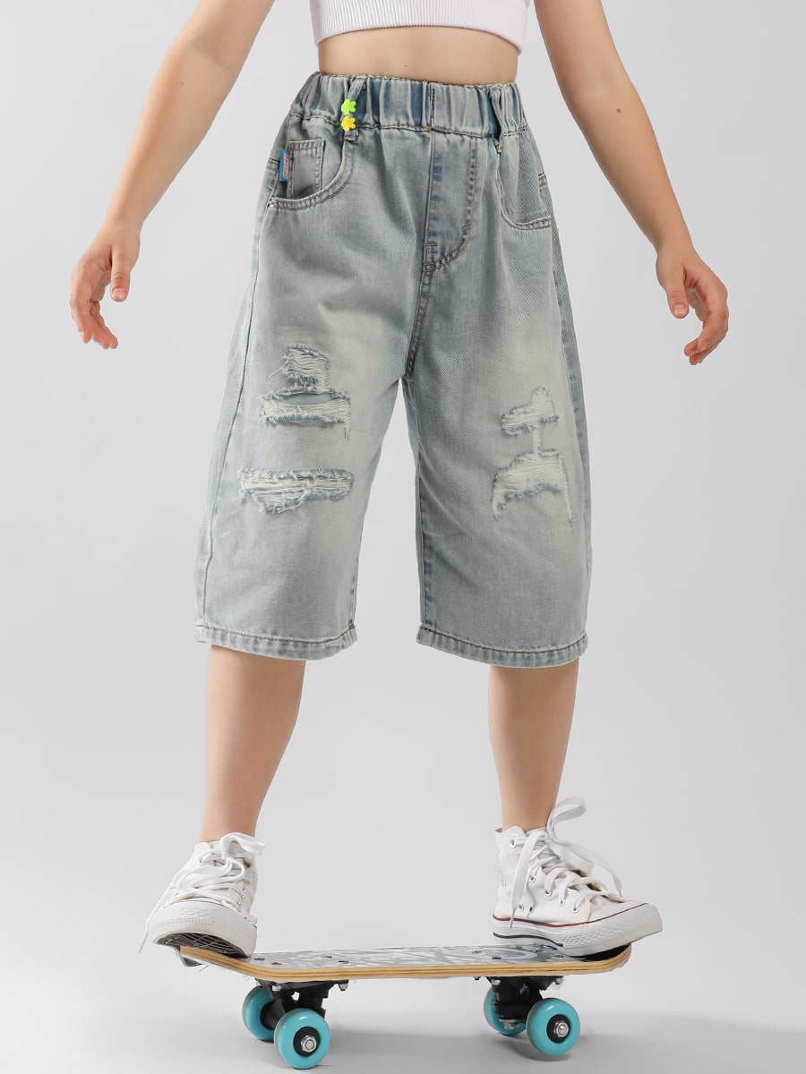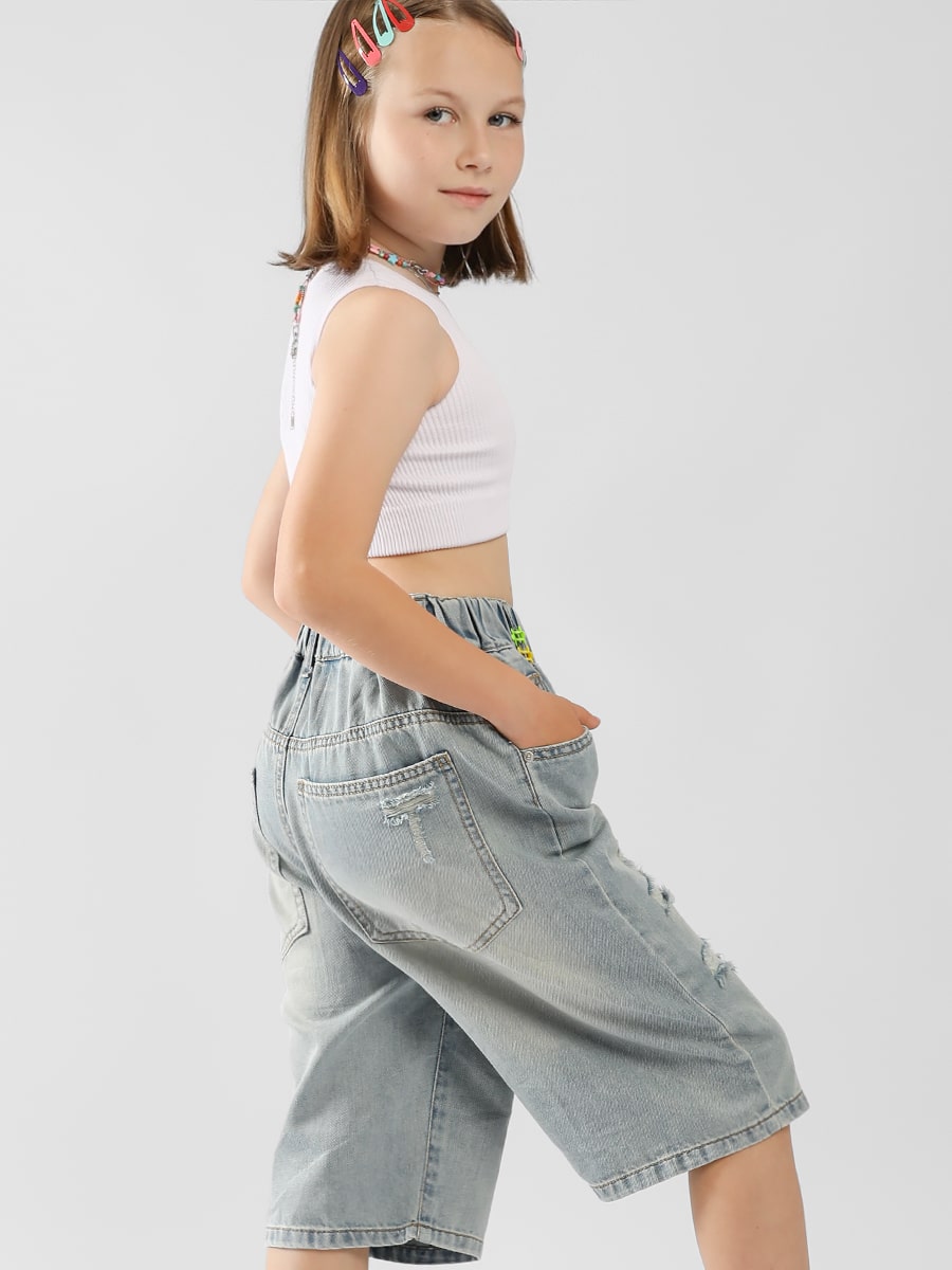 Удлинённые джинсовые шорты для детей, выполненные из хлопкового денима - прочной и износостойкой ткани, которая хорошо пропускает воздух и обеспечивает комфортную носку в жаркие дни. Они легко комбинируются с любой майкой или футболкой. Пояс на широкой, эластичной резинке, без молнии и пуговиц. Акцентные детали в виде искусственных потёртостей.
