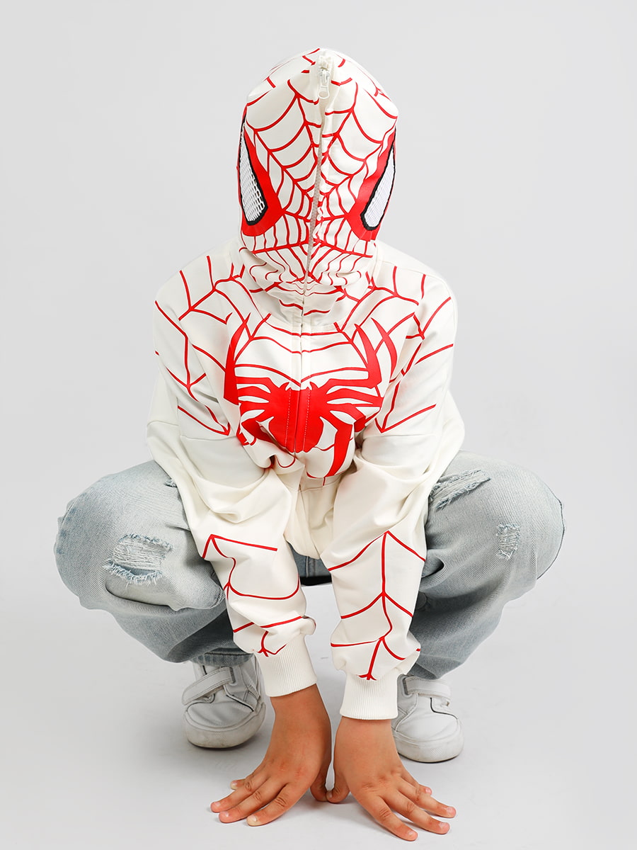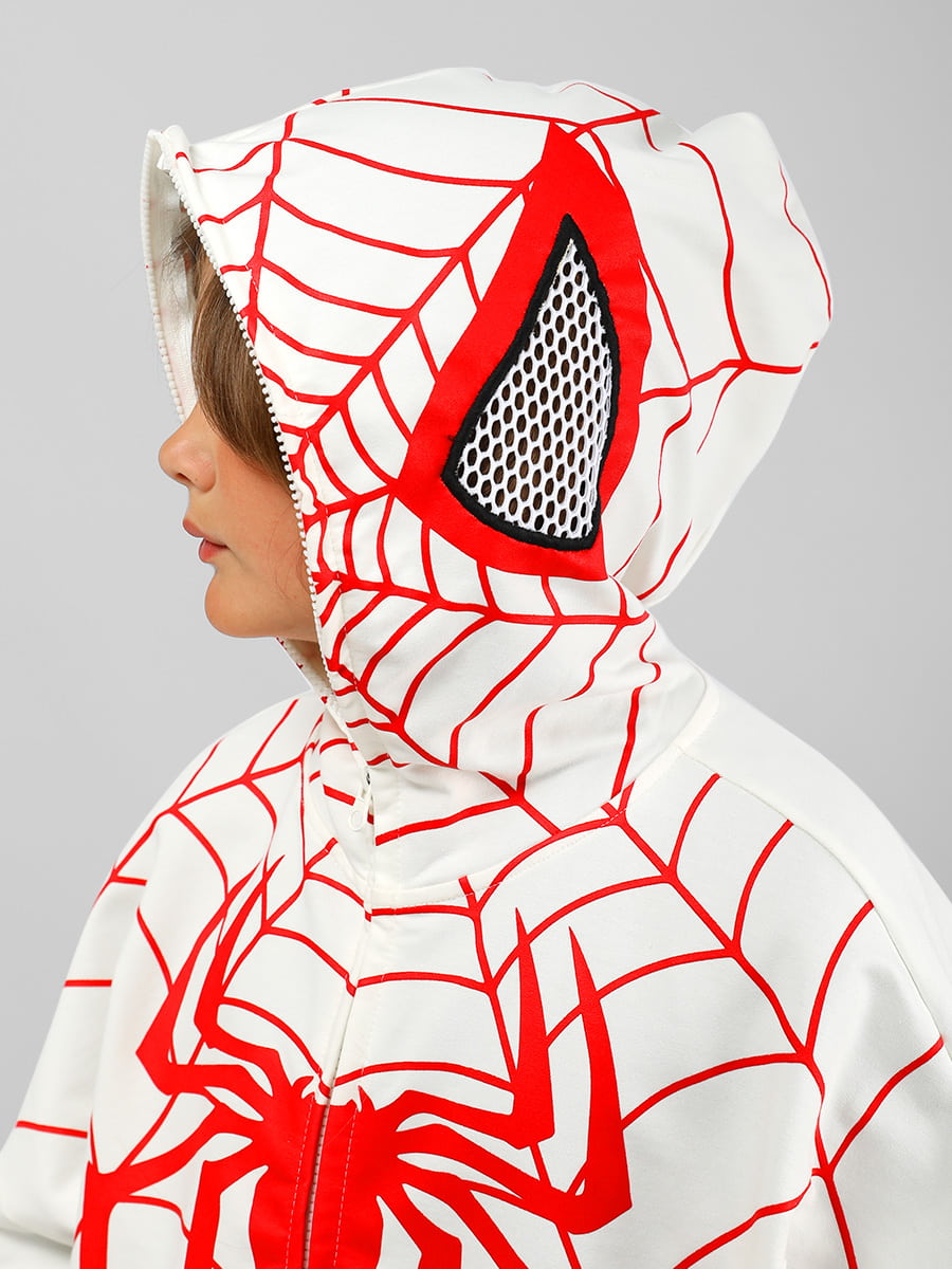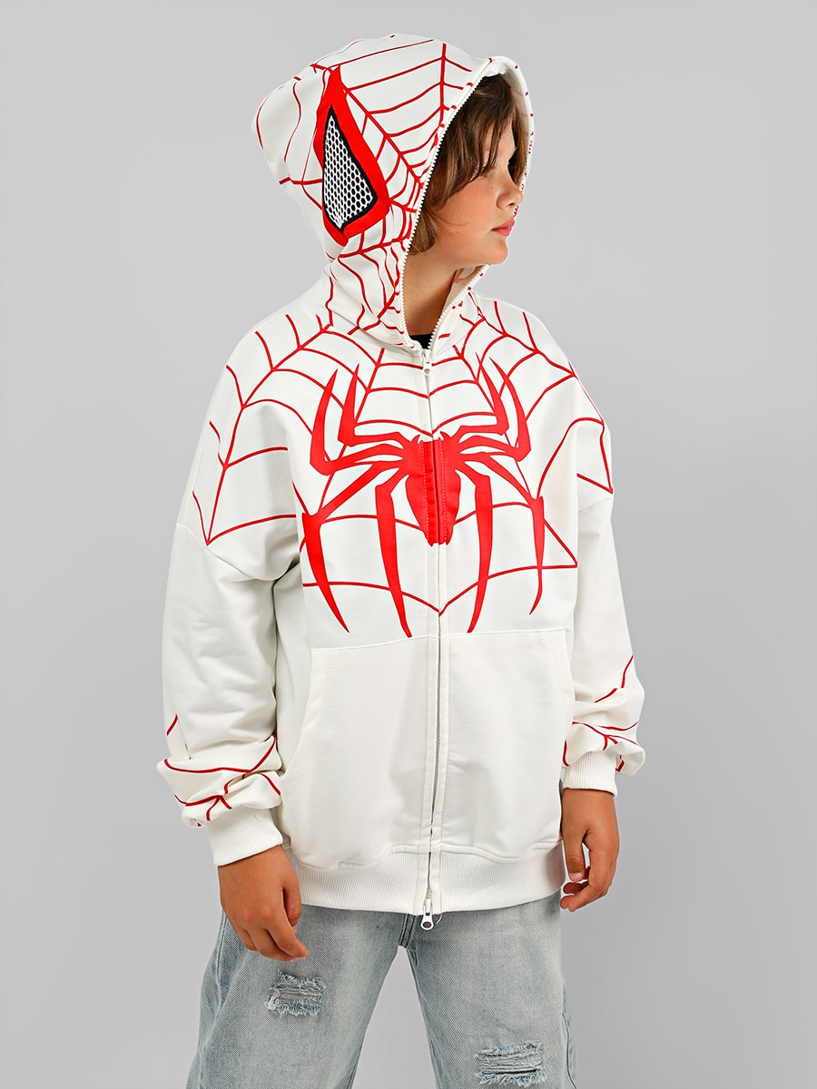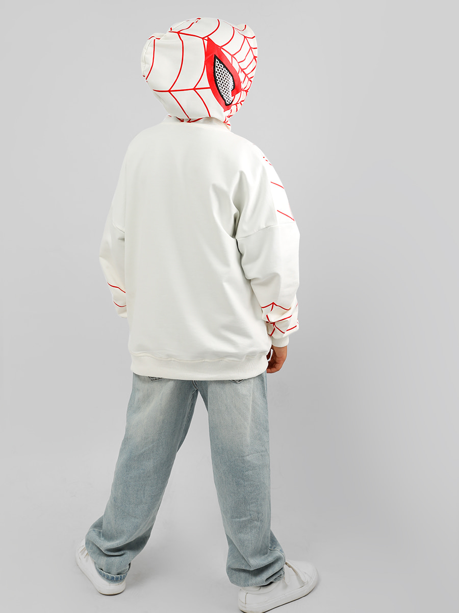 Толстовка Соль&Перец, силуэта оверсайз. Выполнена из плотного и эластичного материала «футер двухнитка», который хорошо пропускает воздух, не теряет форму и приятный к телу. Толстовка по всей длине на молнии, с маской человека паука на капюшоне и ярким принтом. Рукава и низ толстовки с широкими, эластичными манжетами.