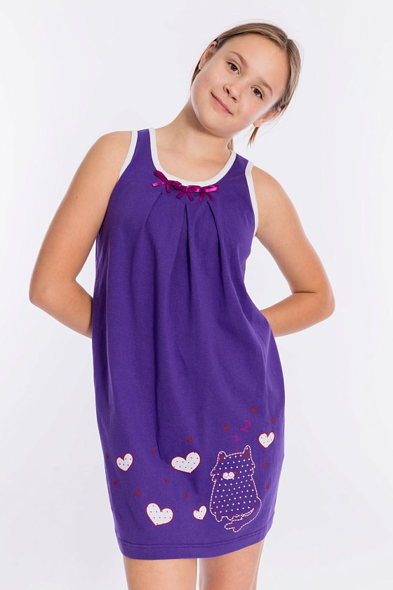 Сорочка из однотонной кулирки. Спереди расположен принт. В качестве отделки бантики и складки по горловине изделия, а также белая бейка в цвет принта.