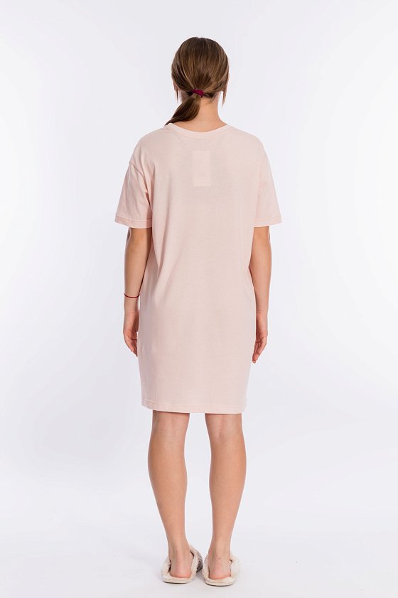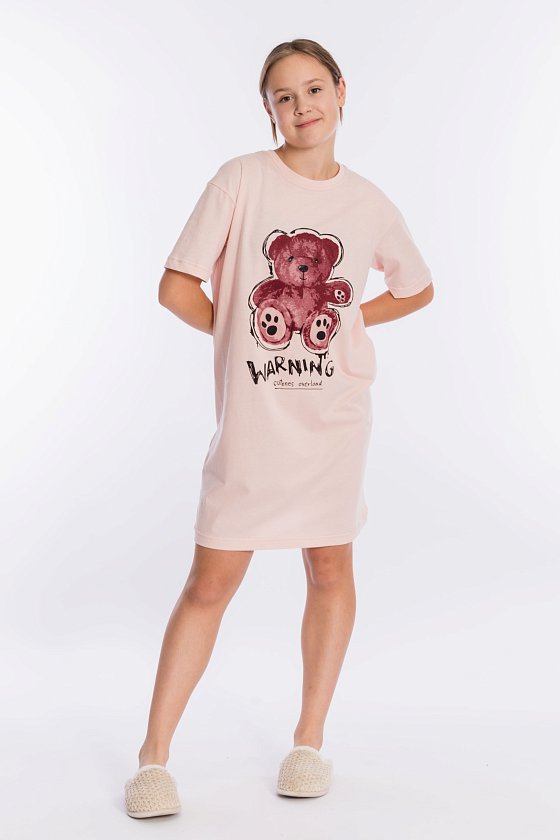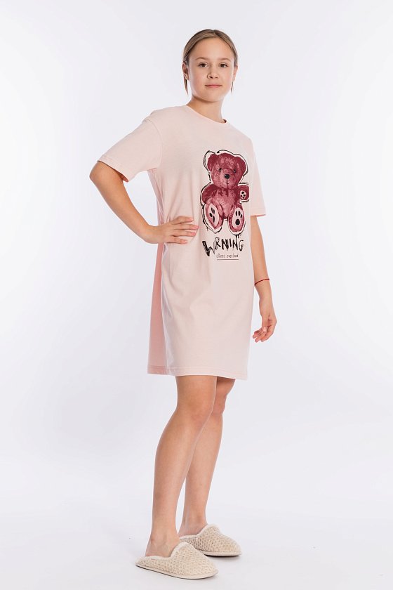 Сорочка-футболка выполнена из однотонной кулирки. С коротким рукавом и принтом спереди. Круглый вырез горловины оформлен планкой.