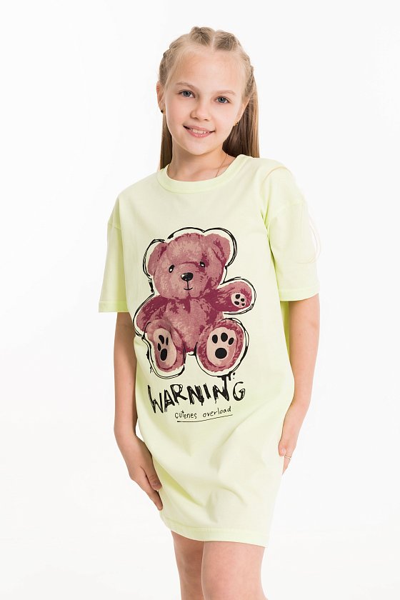Сорочка-футболка для девочки из однотонной кулирки фисташкового цвета очаровательна и уютна. Прямой крой с коротким рукавом и круглым вырезом горловины делают ее комфортной и практичной в использовании. Принт на передней части добавляет игривости и оригинальности к изделию, придавая индивидуальность.
