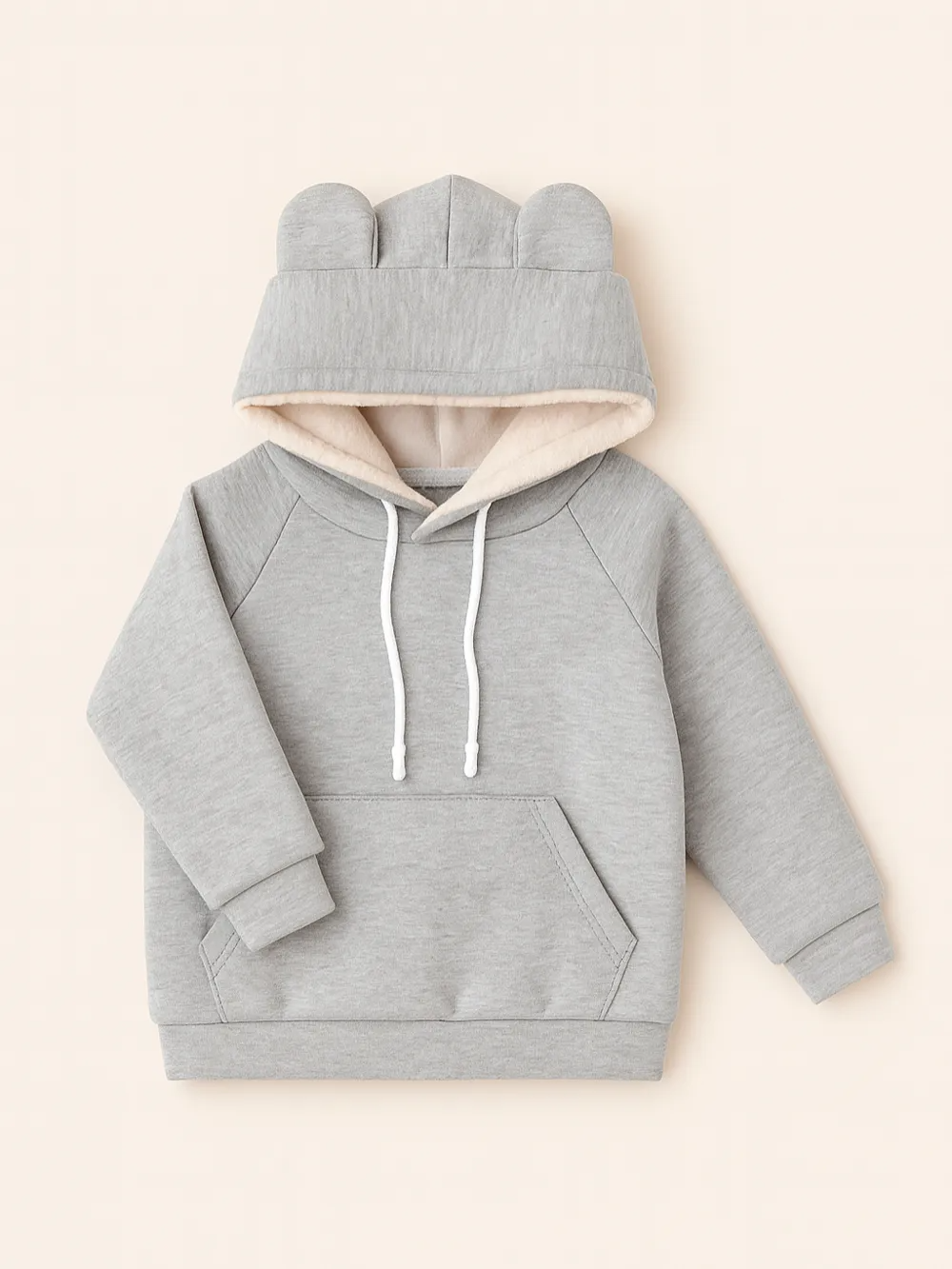 Капюшон на мягком подкладе из велсофта приятно согревает, защищает от ветра и создаёт ощущение максимального уюта. Забавные ушки на капюшоне делают худи невероятно милым и сразу привлекают внимание — ваш малыш будет выглядеть просто очаровательно!