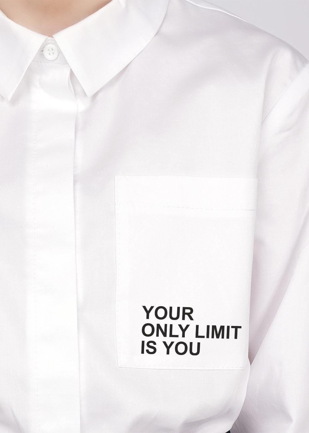 Рубашка в стиле casual, более объёмная и удлиненная. Впереди накладной карман, украшенный принтом. Выполнена из поплина.