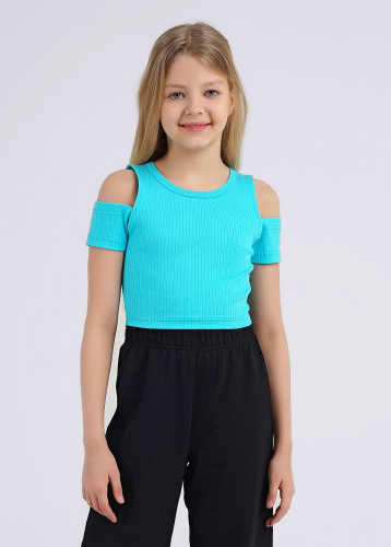 Стильная футболка из эластичной "лапши". Приталенный силуэт, укороченная длина, трендовые вырезы на плечах. Такая модель подарит твоему образу индивидуальность.