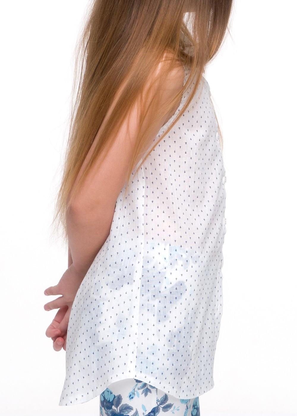 Рубашка для девочки без рукавов, выполнена из поплина в мелкий принт. Воротник рубашечный на стойке, застежка планка на пуговицы. На спинке кокетка. Впереди накладной карман. Низ рубашки полукруглой формы.