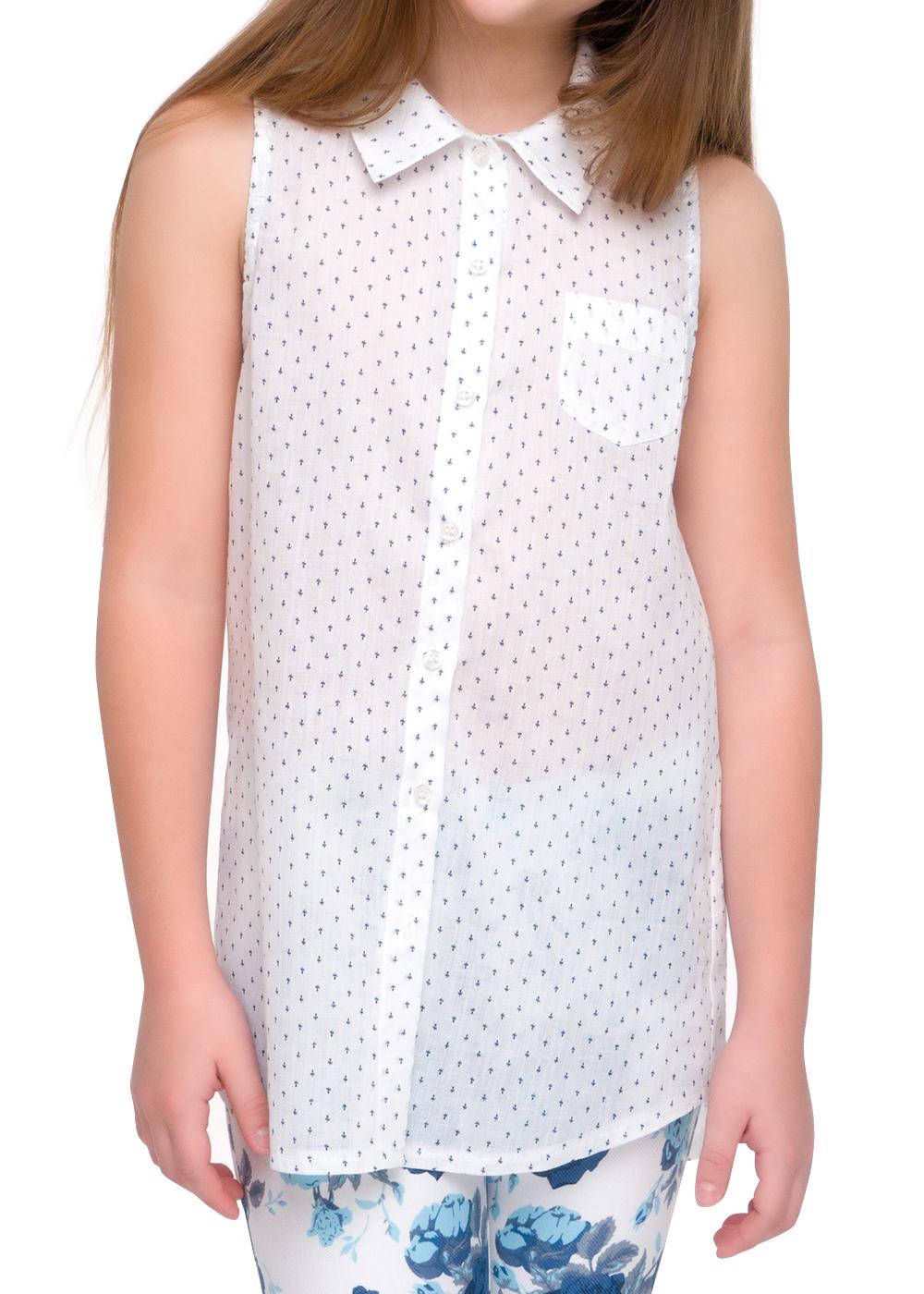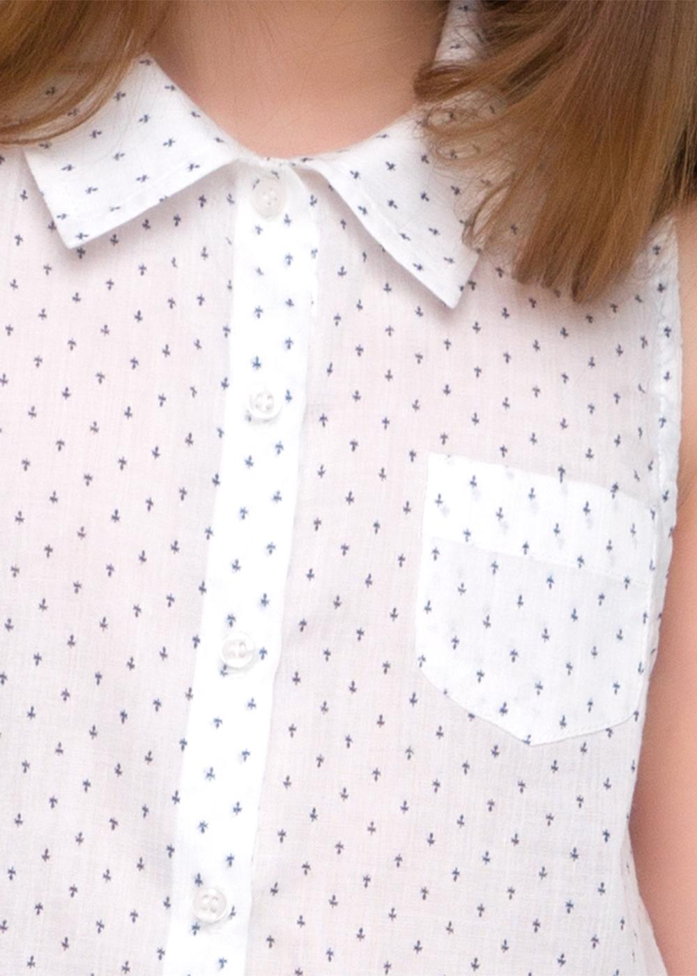 Рубашка для девочки без рукавов, выполнена из поплина в мелкий принт. Воротник рубашечный на стойке, застежка планка на пуговицы. На спинке кокетка. Впереди накладной карман. Низ рубашки полукруглой формы.