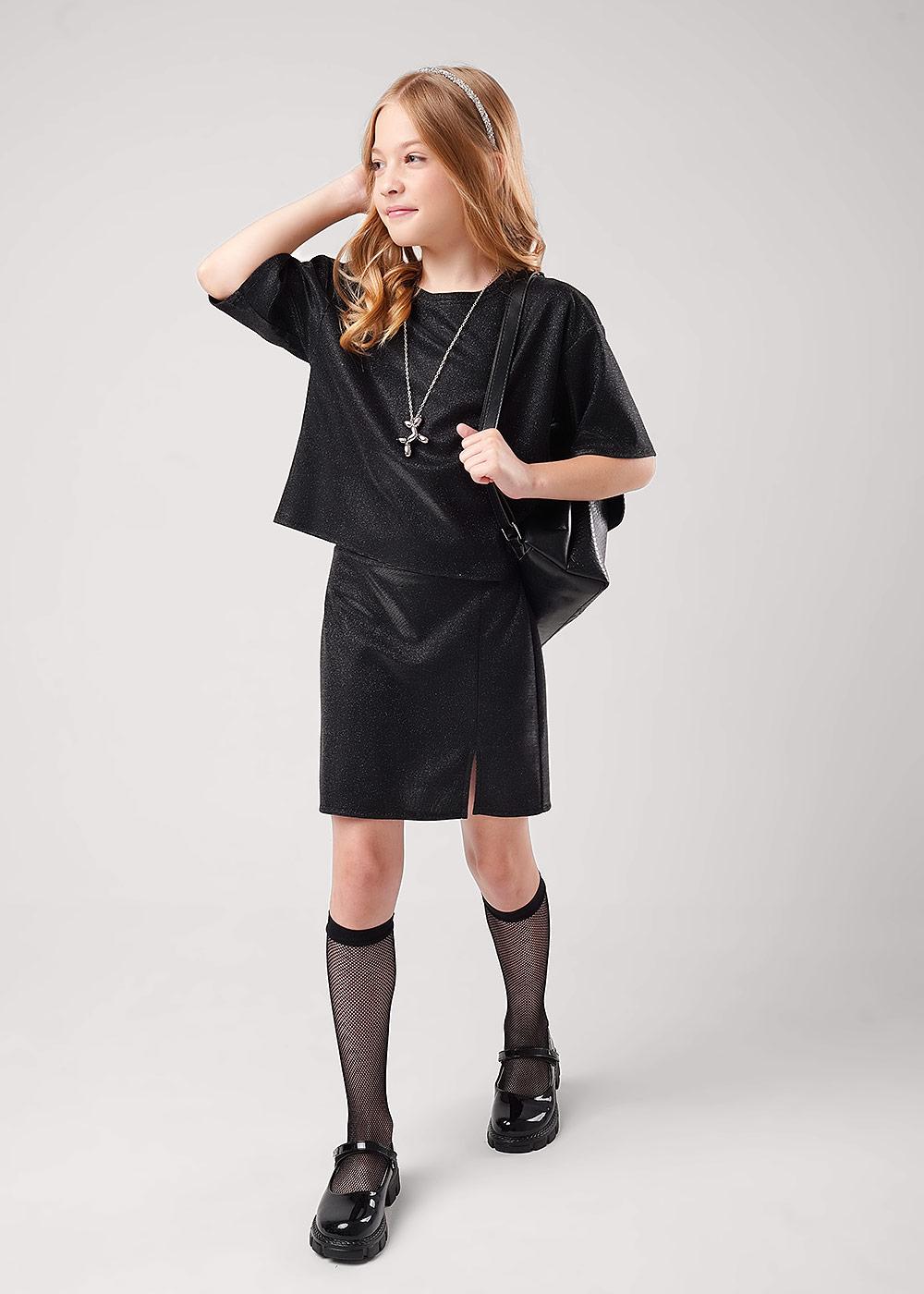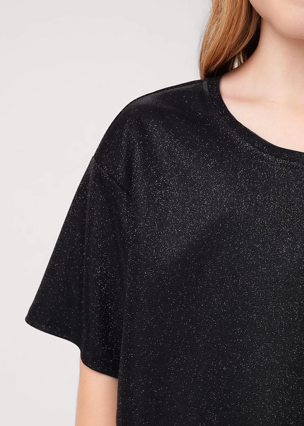 Трендовая укороченная футболка. Сияющая ткань станет фишкой вашего образа! Свободная посадка, эластичная горловина.