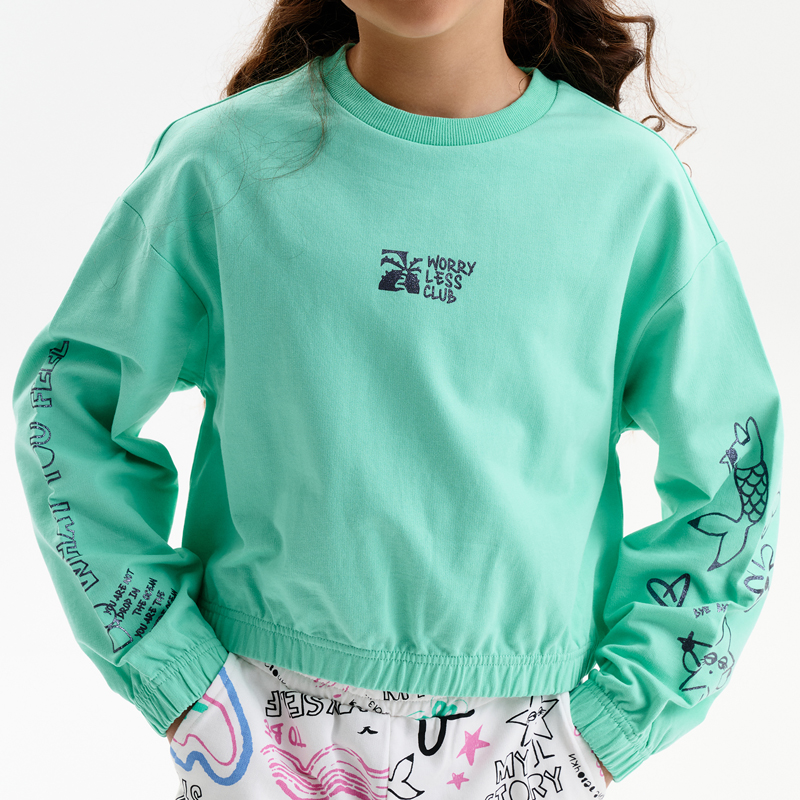 Состав: 100%хлопокОписание: Укороченная объемная толстовка из мягкого футера для девочки. Плотность 235 гр/кв.м. 100% хлопок — ткань дышащая, приятная на ощупь и очень комфортная. Низ изделия и рукавов собраны на широкую внутреннюю резинку — модель красиво и аккуратно сидит по фигуре, рукава не сползают. Весь декор с блестками. Перевод на рукавах: Делай то, что чувствуешь. Ты не капля в океане. Ты — весь океан в капле. Перевод спереди: клуб «Беспокойтесь меньше».