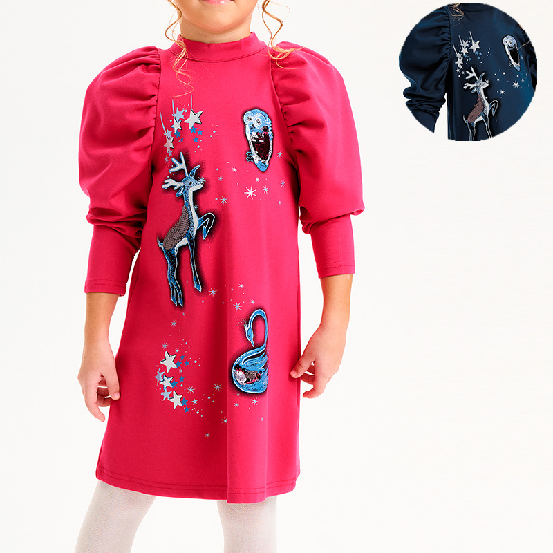 Состав: 60%вискоза 35%полиамид 5%эластан, вставка: 100%хлопокОписание: Нарядное платье, слегка расширенное к низу. Горловину украшает изящная стойка, застёжка на две пуговицы по спинке. Фишка платья в пышных рукавах, объём которых достигнут за счет густой сборки оката. Сборка рукава по внутреннему шву на эластик позволяет регулировать длину. Перед декорирован сказочным принтом с серебряным металликом и пайетками. Новогоднее прямого кроя платье Pelican станет настоящим украшением вашей малышки на утреннике или любом другом празднике. Это нарядное платье, разработанное дизайнерами специально для девочек от года до 5 лет, идеально подойдет для детского сада и для праздничных мероприятий. Модель прямого покроя с длинными рукавами и миди длиной юбки сделана из мягкого и приятного к телу трикотажа, который не стесняет движений. Праздничный вид платью придают яркий волшебный принт с блестками и пайетками (лесной олень, звезды и снежинки, прекрасный лебедь и сова) и рукава-фонарики. Благодаря универсальному цвету, платье будет уместно как на каждый день, так и для особых случаев.