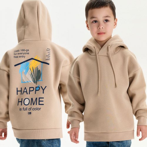 Состав: 60%хлопок 40%полиэстерОписание: Утепленное детское худи с начесом для мальчика. Толстовка оверсайз-силуэта со спущенным плечом не будет стеснять движений ребёнка и подарит комфорт. Объёмное худи средней длины актуально в этом сезоне. Манжеты и пояс по низу изделия выполнены из эластичной рибаны (ткань в рубчик) — она не растягивается, сохраняет отличную форму надолго. Капюшон с двумя швами — это обеспечивает анатомически правильную форму и комфортную посадку по голове. Капюшон двойной, швы закрыты. Шнуром можно регулировать высоту и объём. Толстовка неприхотлива в уходе. Худи с принтом на спине выполнено из ткани с высоким содержанием качественного хлопка (футер с начёсом), что обеспечивает мягкость и хорошую воздухопроницаемость. Благодаря полиэстеру худи сохраняет цвет и форму в течение длительного времени. Модный принт в плакатном стиле изображает домик с текстом «уютный дом, который побуждает тебя мечтать», «счастливый дом полон цвета». Принт эластичный и стойкий, отлично переносит частые стирки. Худи бежевое — универсальный цвет, толстовку легко сочетать с брюками разных цветов. Стильное худи оверсайз для мальчиков и подростков. Худи с начёсом подходит для круглогодичной носки: осенью и весной (демисезон), зимой, в прохладную погоду летом. Толстовку можно носить в детский сад, на прогулки, на отдых, а также дома.
