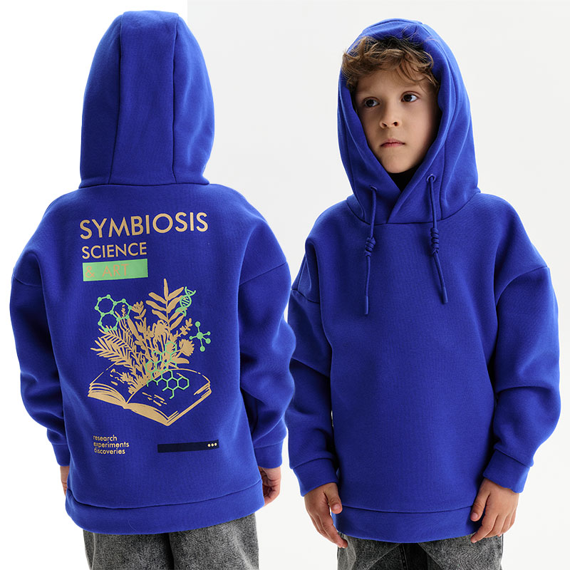 Состав: 60%хлопок 40%полиэстерОписание: Худи с начесом для мальчика. Теплая толстовка выполнена из футера 3-нитки с начесом, плотность ткани 330 г/м2. Такая кофта идеально подойдет для холодных осенних и зимних дней. Манжеты рукавов выполнены из основного материала, по низу изделия пояс из основной ткани, это немного сдерживает объём, модель смотрится аккуратно. Капюшон с двумя швами, что обеспечивает анатомически правильную форму и комфортную посадку по голове. Капюшон двойной, швы закрыты. Шнуром можно регулировать высоту и объём. За изделием просто ухаживать. Худи с принтом на спине выполнено из ткани с высоким содержанием качественного хлопка (футер с начёсом), что обеспечивает мягкость и воздухопроницаемость. Благодаря полиэстеру толстовка сохраняет цвет и форму в течение долгого времени. Оригинальный принт изображает книгу с растениями и биологическими символами с надписями «симбиоз науки и искусства», «исследования, эксперименты, открытия». Принт эластичный и прочный, без проблем переносит многочисленные стирки. Худи синее, выполнено в модном оттенке «ультрамарин». Отличное худи оверсайз для мальчиков и подростков. Худи с начёсом можно носить круглый год: осенью и весной (демисезон), зимой, в прохладную погоду летом. Толстовка подходит для детского сада, прогулок, активного отдыха, а также для дома. Это замечательный подарок сыну, брату, внуку или племяннику на любой праздник.