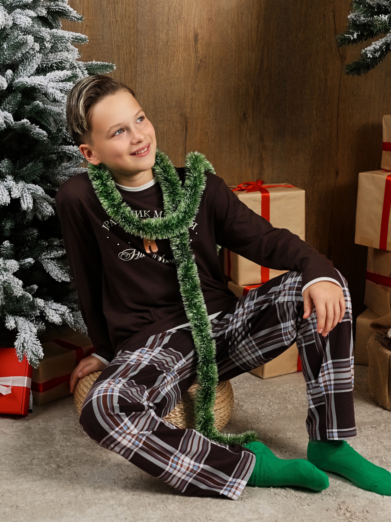 Костюм для мальчика из трикотажного полотна "кулирка" в комбинации двух видов: гладкокрашенного и с рисунком в крупную клетку, сочетающихся между собой по цвету, состоящий из джемпера и брюк. Джемпер - из гладкокрашеного полотна, свободного покроя, с длинными втачными рукавами и приспущенными плечами, с горловиной овальной формы и тематическим принтом, выполненным в технике шелкографии. Горловина, нижние срезы рукавов и низ изделия обработаны подгибкой с отделочным широким кантом контрастного цвета. Брюки - из полотна в клетку, свободного покроя, прямые, на притачном поясе с эластичной тесьмой внутри, с карманами в боковых швах. Нижние срезы обработаны подгибкой.