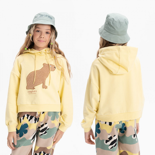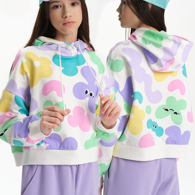 Состав: 100%хлопокОписание: Укороченная толстовка с капюшоном от Pelican – это стильный и удобный выбор для юных модниц. Эта кофта выполнена из 100% хлопка (футер), что обеспечивает мягкость, воздухопроницаемость и комфорт в носке. Модель представлена в трендовом цвете и украшена ярким дизайнерским принтом. Укороченный крой и свободный покрой оверсайз делают толстовку идеальным вариантом для повседневной носки, занятий спортом или походов в детский сад или школу. Капюшон с утяжкой на шнурке и кнопкой позволяет регулировать степень защиты от ветра и холода. Эта толстовка легко сочетается с любым низом, создавая стильные и комфортные образы для младшей, средней и старшей школы, а также для прогулок в детский сад.
