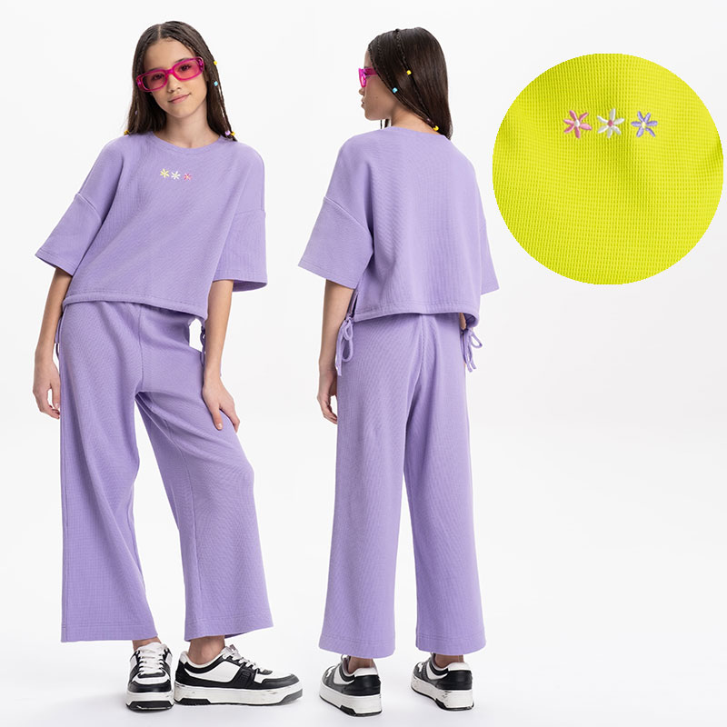 Состав: верх: 95%хлопок 5%эластан, низ: 95%хлопок 5%эластанОписание: Выбирайте нужный размер по таблице размеров на фото. Цвет товара на экране вашего устройства может отличаться от цвета изделия вживую. Комплект для девочки k - pop (кроп-топ и кюлоты), в котором собраны все самые актуальные тренды. Кроп - топ оверсайз - силуэта с сильно спущенным плечом дополнен утяжками по низу, с помощью которых можно регулировать объём и менять силуэт изделия. Брюки на широкой резинке с внутренней регулировкой объема шнуром. Благодаря особенностям кроя спортивный костюм со штанами долго будет расти вместе с ребенком. Комплект двойка выполнен из трикотажного полотна с модной вафельной текстурой. В составе ткани преобладает хлопок, поэтому модель комфортная, приятная на ощупь, в ней не будет жарко летом. Эластан в составе ткани помогает изделию сохранять форму. Ткань проста в уходе. Изюминка топа - футболки — лаконичная вышивка в виде трёх цветков. Комплект идеально сядет на девочку или подростка любой фигуры, можно покупать без примерки. Детский костюм для настоящих модниц, в нем каждая девочка будет выглядеть стильно и эффектно.