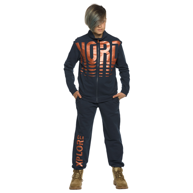 Состав: верх: 100%хлопок, низ: 100%хлопокОписание: Комплект для мальчиков из футера толстовка и брюки. Толстовка на разъёме с воротником стойкой. По низу рукава и низу изделия манжеты из рибаны. Молния тракторная из пластика, пуллер металлический. По центру rubber принт из бронзового металлика. Перевод Север. Брюки нового современного объема по бедрам и в области колена, слегка заужены книзу. В боковых швах карманы. Пояс из основной ткани на резинке с дополнительной регулировкой внутренним шнурком. Манжеты из рибаны. По правой стороне rubber принт из бронзового металлика Исследовать.