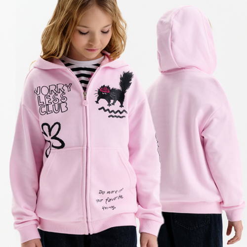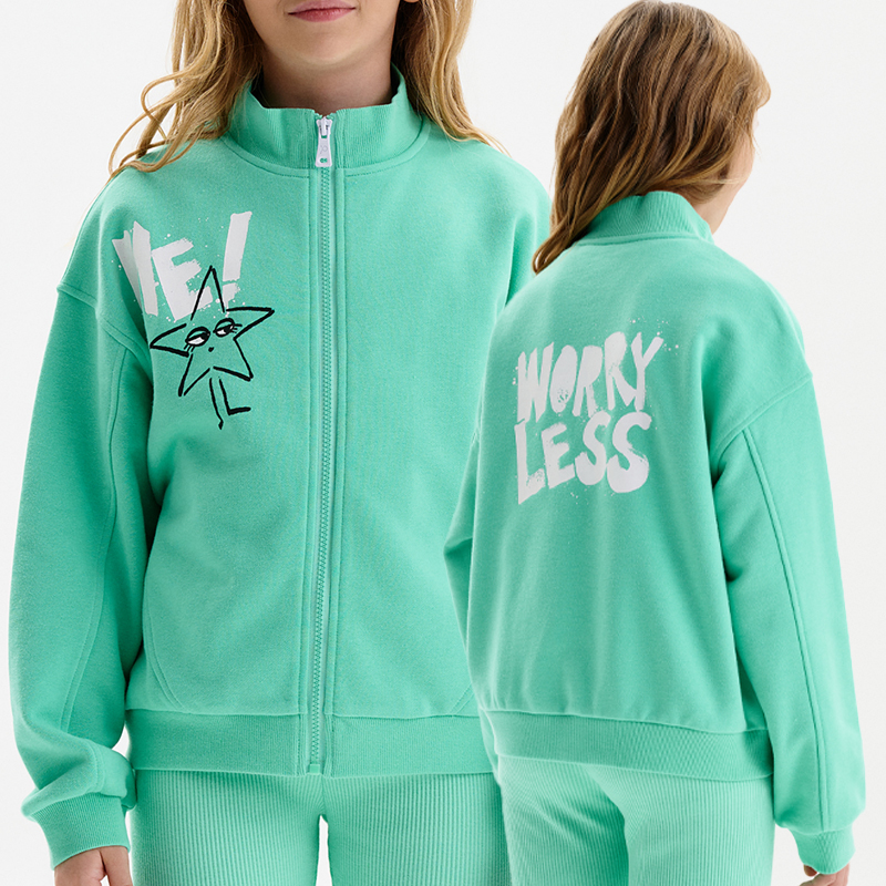 Состав: 87%хлопок 13%полиэстерОписание: Oversize толстовка для девочки средней длины из хлопкового футера, на центральной молнии. Модель увеличенного объёма по линии груди и по низу, со спущенным мягким плечом и аккуратной проймой. Воротник-стойка выполнен из рибаны, низ изделия и рукавов фиксируются плотной рибаной. По переду и рукавам предусмотрены декоративные членения с аккуратной отстрочкой — усиливают визуальный эффект и сохраняют форму. Принты с блестками. Перевод спереди: мне, меня, мной. Перевод на спинке: беспокойтесь меньше.