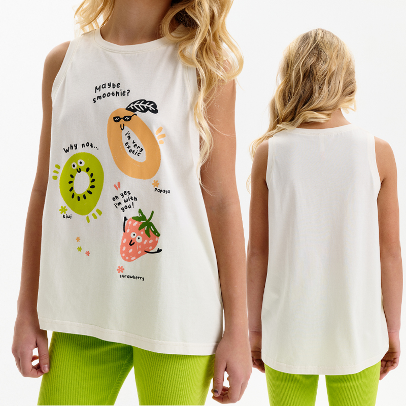 Состав: 100%хлопокОписание: Майка для девочки. Выполнена из мягкого трикотажного полотна. Свободный трапециевидный силуэт с лёгким перепадом по низу делает модель удобной и не сковывает движения. Горловина и проймы аккуратно обработаны эластичной рибаной в тон ткани. Перевод: МОЖЕТ БЫТЬ СМУЗИ? ПОЧЕМУ НЕТ... О, ДА Я С ВАМИ! Я ОЧЕНЬ ЭКЗОТИЧНА. ПАПАЙЯ, КИВИ, КЛУБНИЧКА.