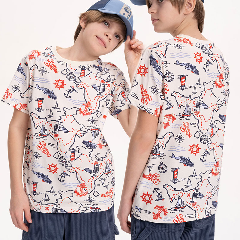 Состав: 100%хлопокОписание: Футболка для мальчика прямого кроя - это идеальный выбор для активного ребенка. Вырез горловины обработан эластичной тканью — она прекрасно держит форму, не растягивается, при этом ребёнку удобно надевать и снимать футболку. Футболка украшена принтом в морском стиле. Спортивная футболка подходит как для подростков так и для малышей в детский сад. Подходит для любого времени года.