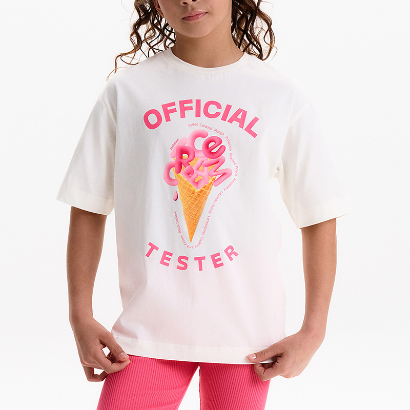 Состав: 100%хлопокОписание: Футболка для девочки умеренного объема. Выполнена из 100% хлопка. Эластичная рибана на вырезе горловины гарантирует, что футболка будет легко надеваться и сниматься, не теряя при этом своей формы. Перевод: официальный тестировщик мороженого.