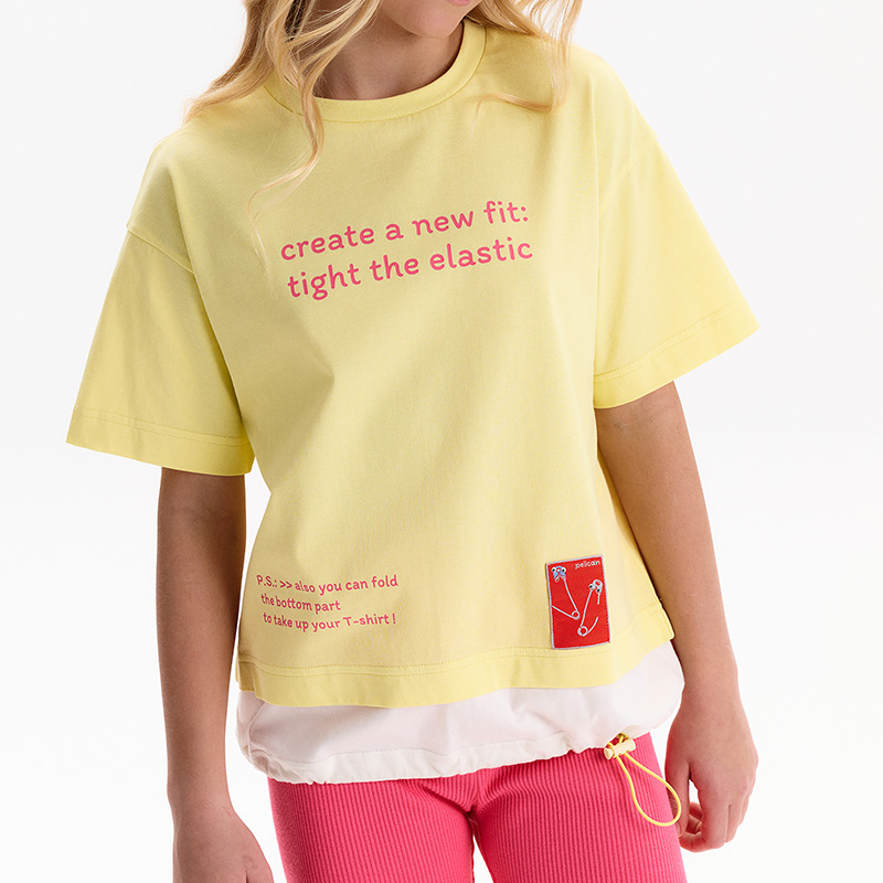 Состав: 100%хлопокОписание: Футболка-трансформер для девочки oversize. Модель свободного кроя, средней длины. Выполнена из 100% хлопка. Плечо спущено, посадка комфортная. Эластичная рибана на вырезе горловины гарантирует, что футболка будет легко надеваться и сниматься, не теряя при этом своей формы. Главная особенность — низ-трансформер: конструкция создаёт эффект, будто поверх надета вторая футболка. Внутри по низу — утяжка со стоппером: при затяжке нижняя часть заправляется внутрь, и модель выглядит как укороченная однослойная футболка. Перевод: потяни и создай новый силуэт! Также ты можешь подогнуть низ чтобы укоротить топ!