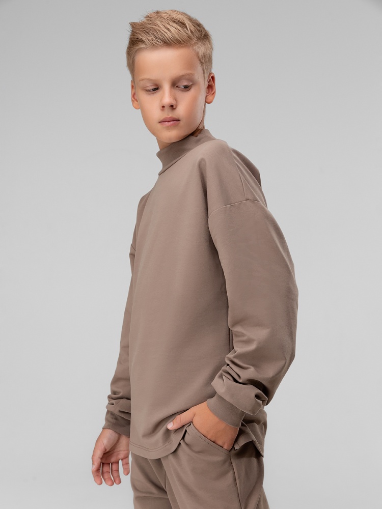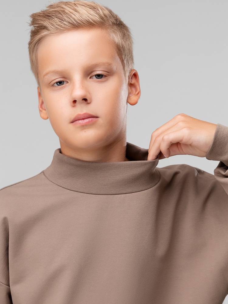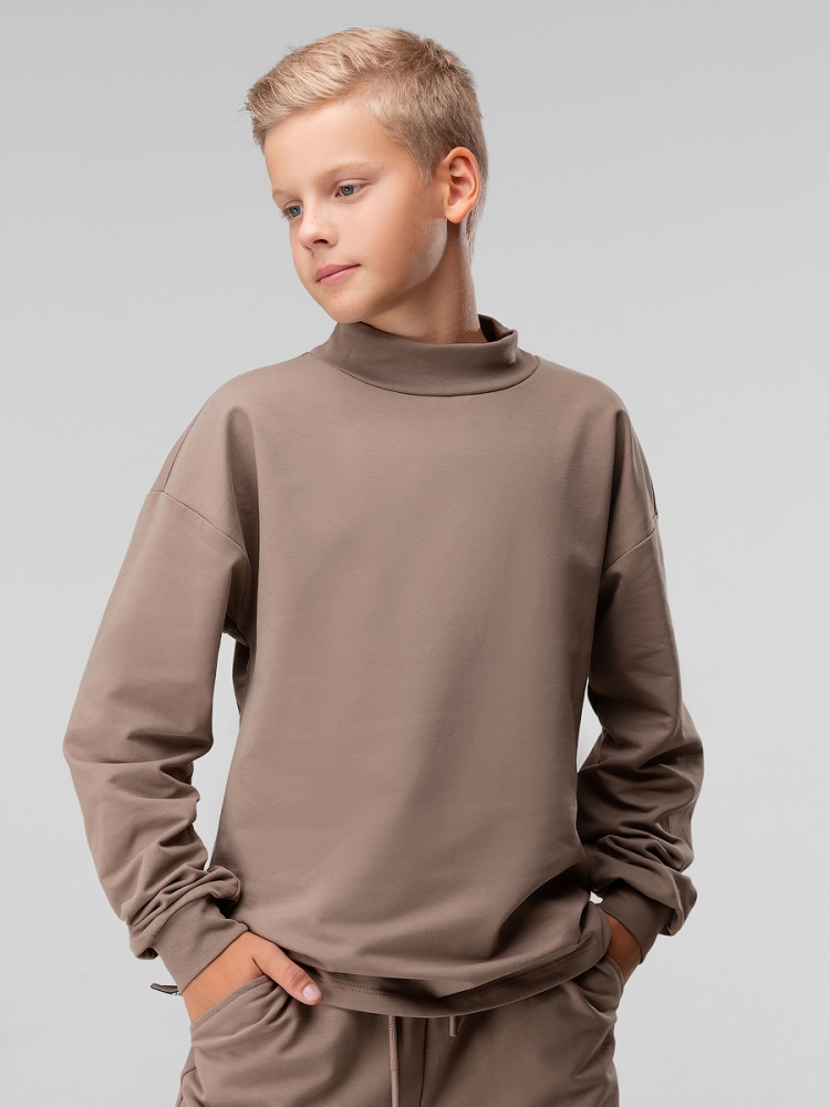 Материал футер двухнитка Состав 92% хлопок 8% лайкра Свитшот для детей школьного возраста. Свитшот свободного силуэта с втачным рукавом с манжетой. Горловина-стойка выполнена из рибаны. Уровень низа полочки короче уровня низа спинки. В боковых швах разрезы.