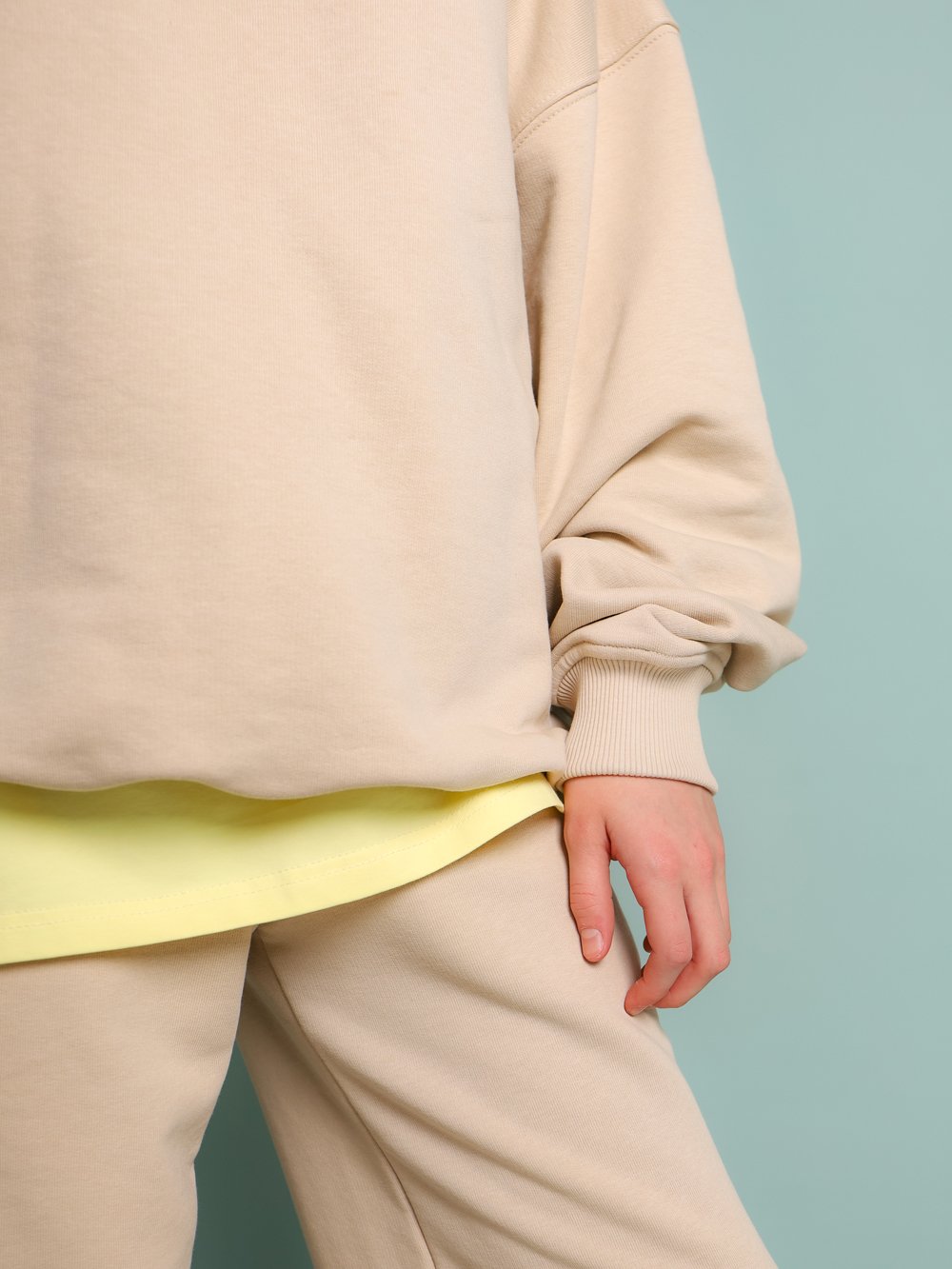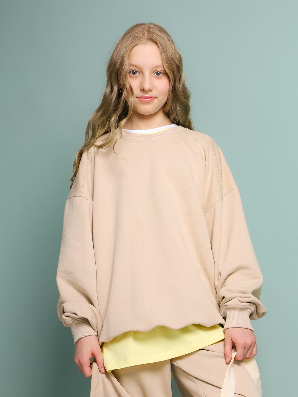 Объемный свитшот с округлым вырезом горловины.Спущенная линия плеча. Объемные рукава. Манжеты, отделка горловины и низа - из кашкорсе.