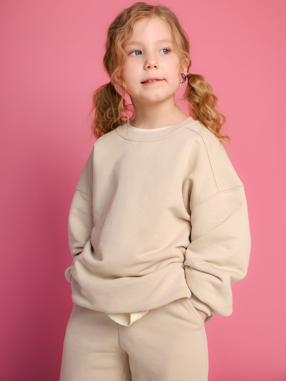 Объемный свитшот с округлым вырезом горловины.Спущенная линия плеча. Объемные рукава. Манжеты, отделка горловины и низа - из кашкорсе.