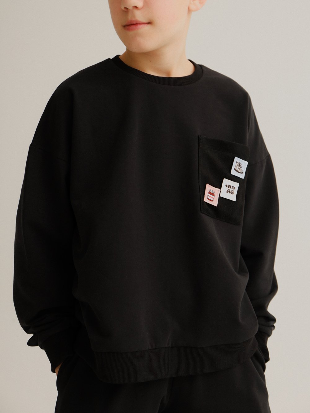 Свитшот свободного кроя с нагрудным карманом с декоративными шевронами на липучках. Манжеты на рукавах и по низу изделия - из кашкорсе