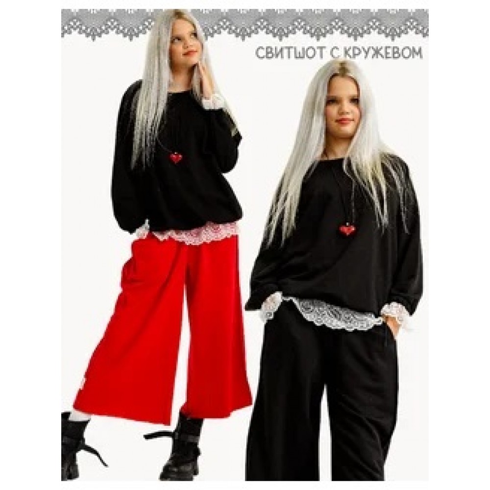 Свитшот с кружевом от STEFANIKA - это стильное и комфортное решение для повседневного образа. Модель свободного кроя выполнена из мягкого футера 3-х нитка, который приятен к телу и не сковывает движений. Декоративные элементы из эластичного кружева по низу изделия и рукавам придают свитшоту изысканный вид. Модель представлена в универсальном черном цвете, что позволяет легко комбинировать ее с другими предметами гардероба. Свитшот станет отличным выбором для активных девочек, ценящих комфорт и стиль.
