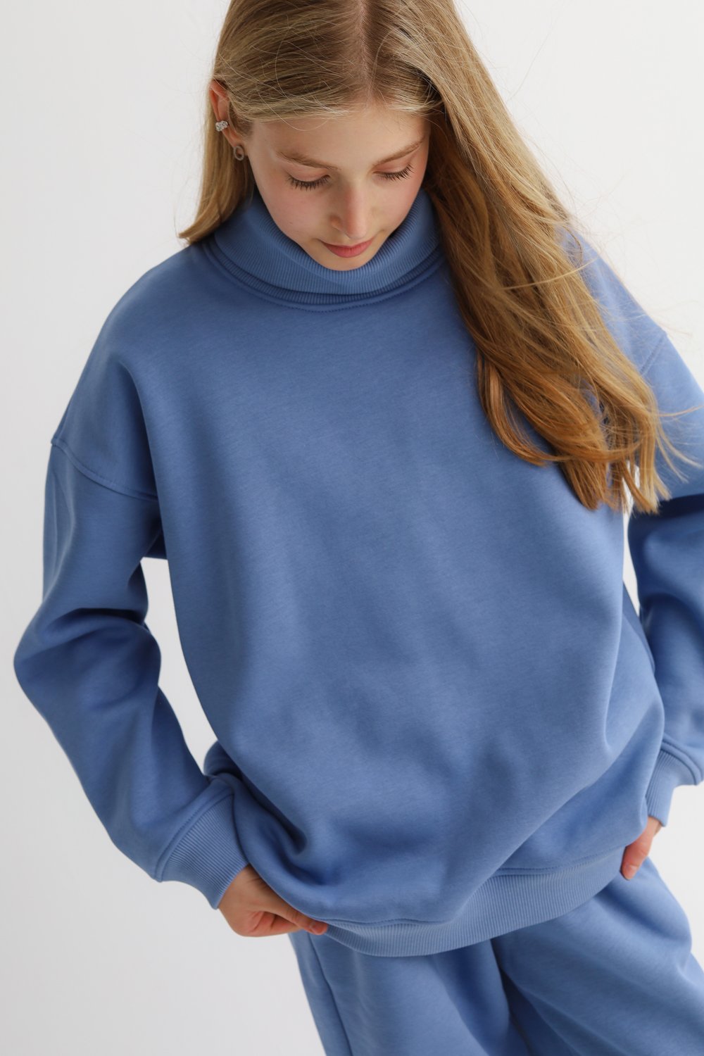 Объемный свитшот. Спущенная линия плеча. Высокий воротник-стойка с возможностью подворота. Манжеты на рукавах и по низу изделия - из кашкорсе