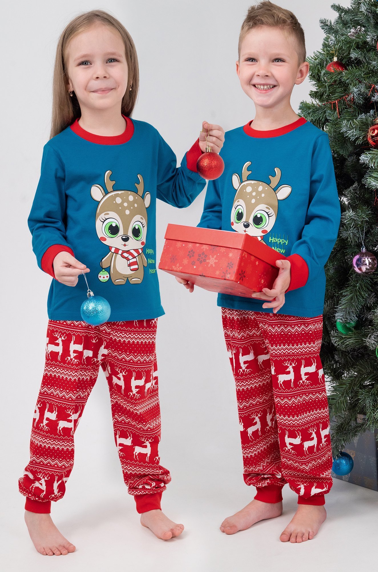 Детская новогодняя пижама с брюками выполнена из натурального 100% хлопка. Свободный крой не сковывает движений и позволяет ребенку всегда оставаться активным, а праздничный принт Олененок создает уютную атмосферу и поднимает настроение. Трикотажная пижамка для мальчиков и девочек станет отличным подарком на Новый год и Рождество.