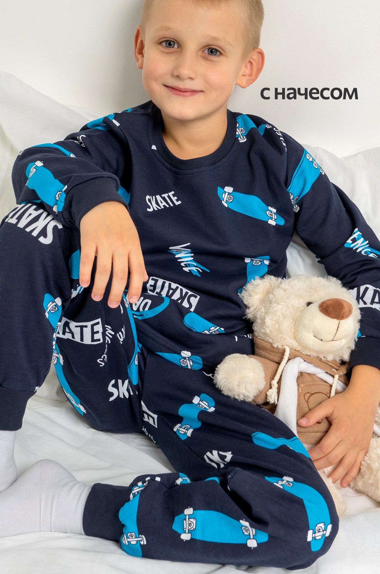 Теплая детская пижама с брюками для мальчиков выполнена из 100% хлопка. Пижама из футера с начесом станет любимым атрибутом отдыха благодаря свободному крою и симпатичному дизайну. Пижамка украшена принтом скейт.