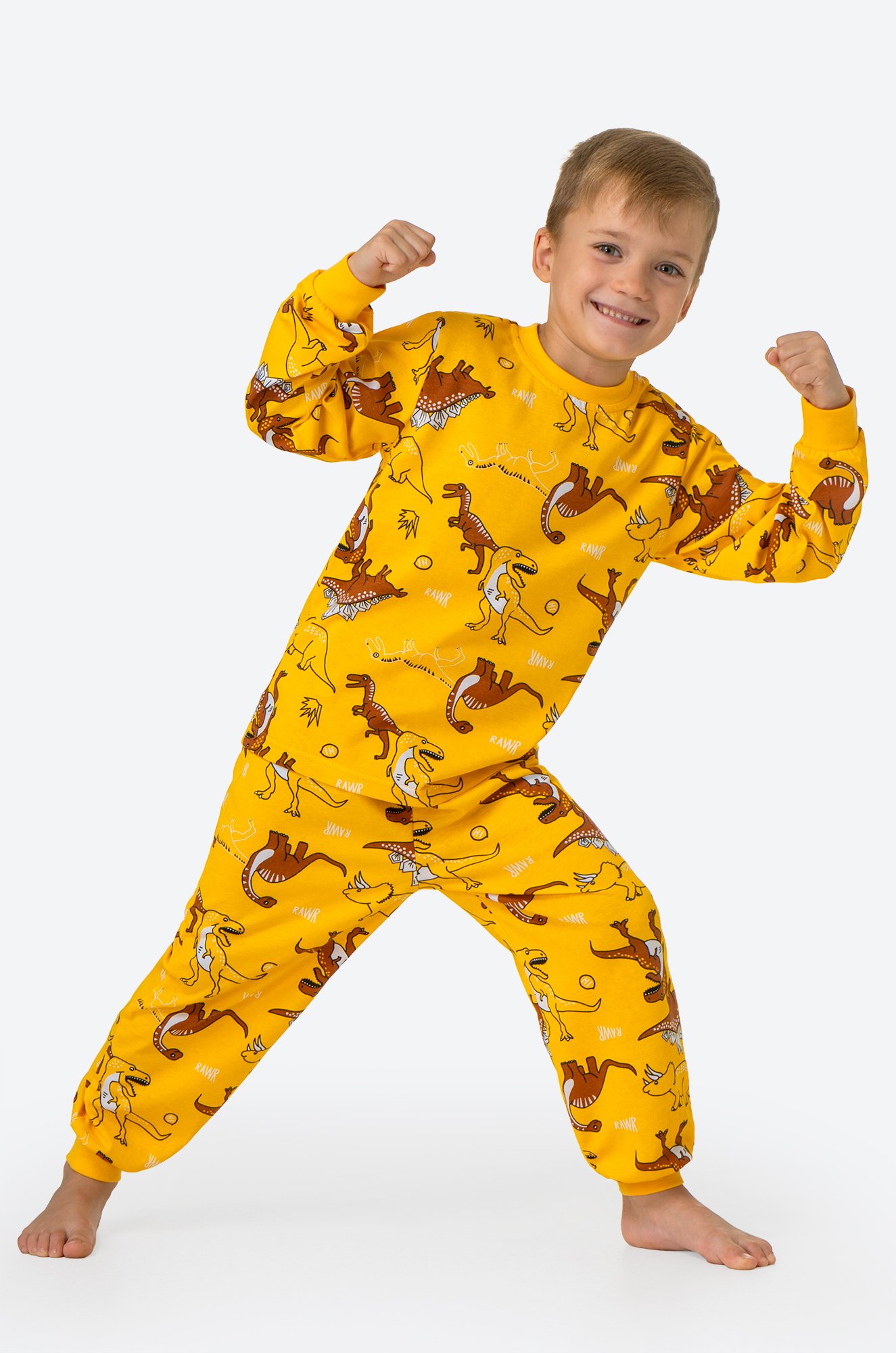 Очаровательная пижама для мальчика в я..показатьрком желтом цвете с принтом Динозавры сделает домашние вечера ещё уютнее. Хлопковая трикотажная ткань мягкая и приятная, а забавный рисунок добавляет настроения на каждый день.