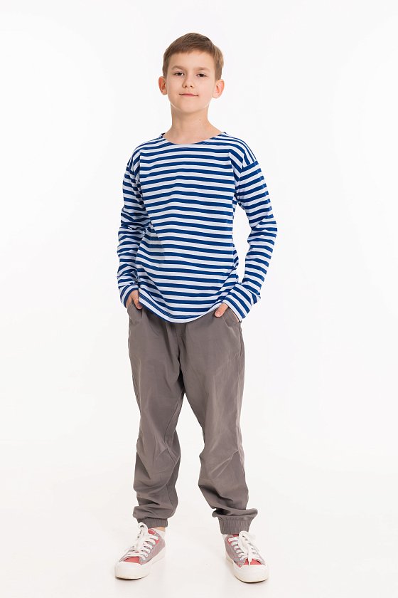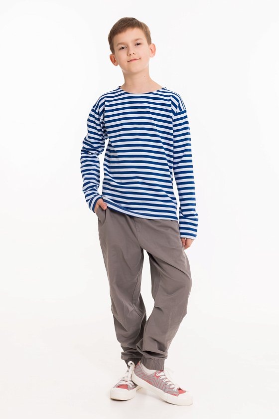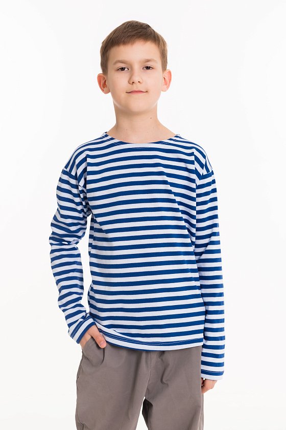 Тельняшка детская с длинным рукавом выполнена из хлопкового полотна.