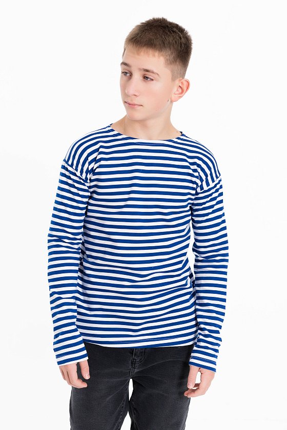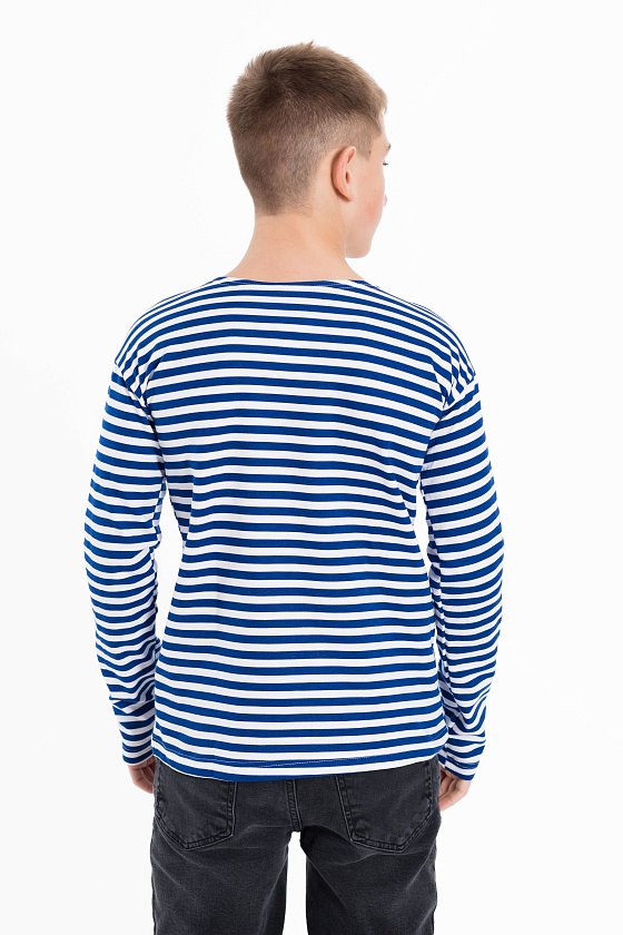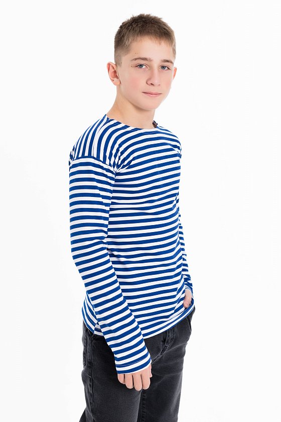 Тельняшка детская с длинным рукавом выполнена из полотна с начёсом.