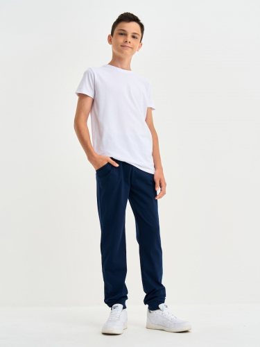 Спортивные брюки для мальчика на поясе резинке с манжетами. Штаны выполнены из трикотажного полотна кулирная гладь, состав: 95% хлопок 5% эластан.
