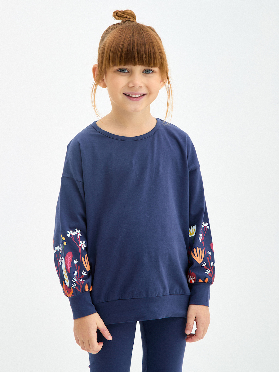 Джемпер для девочки оверсайз, с рукавами декорироваными принтом
