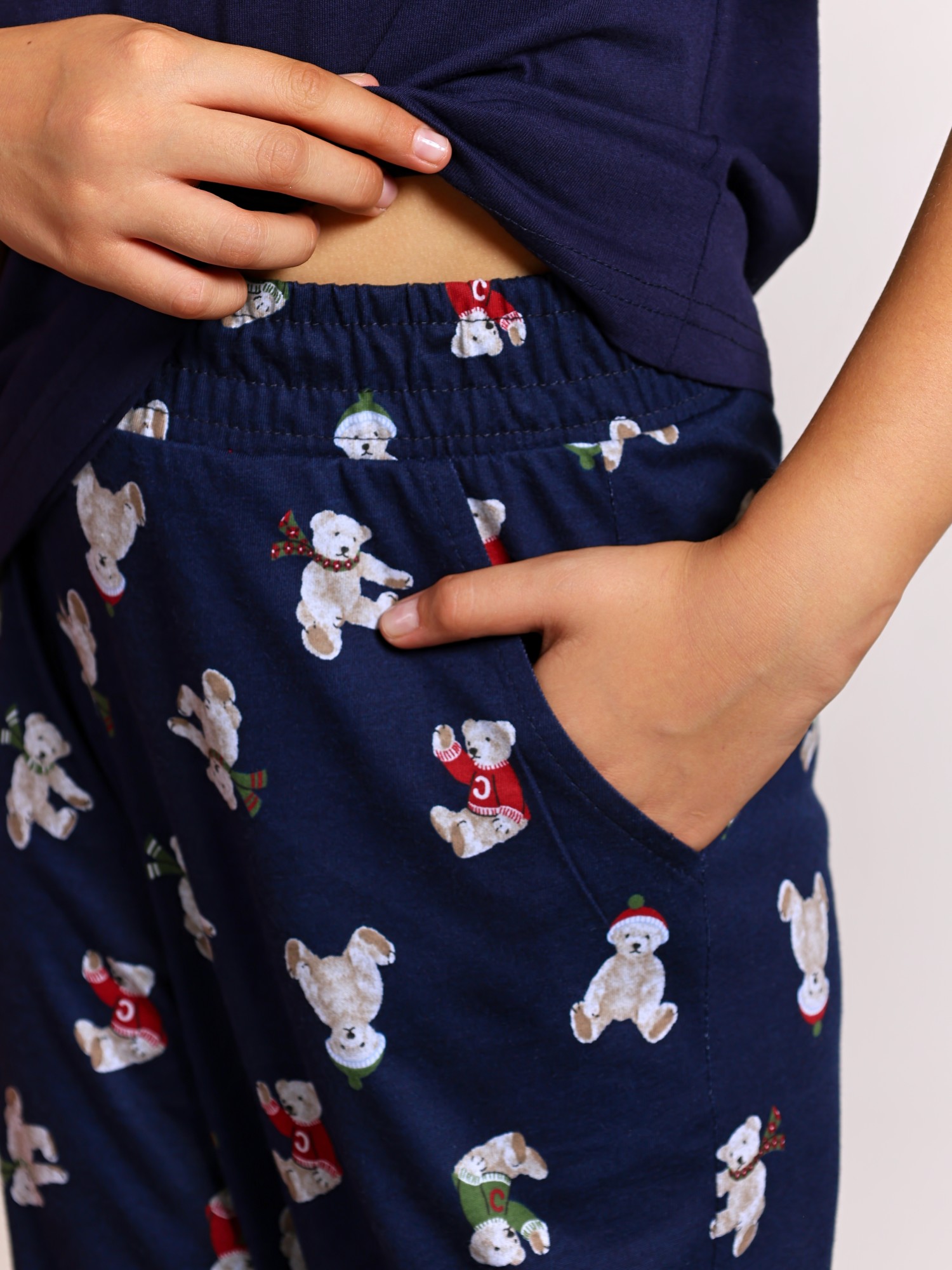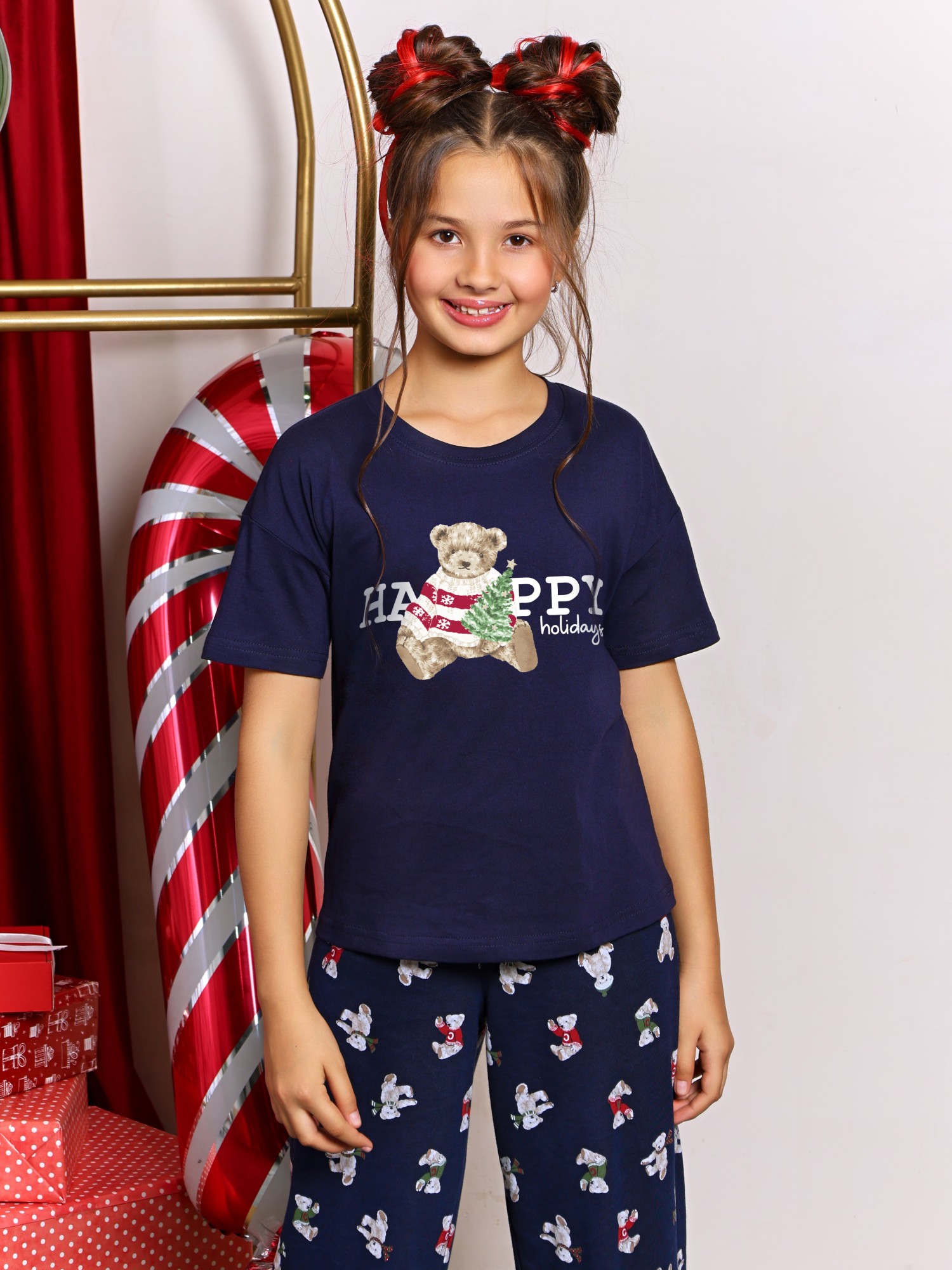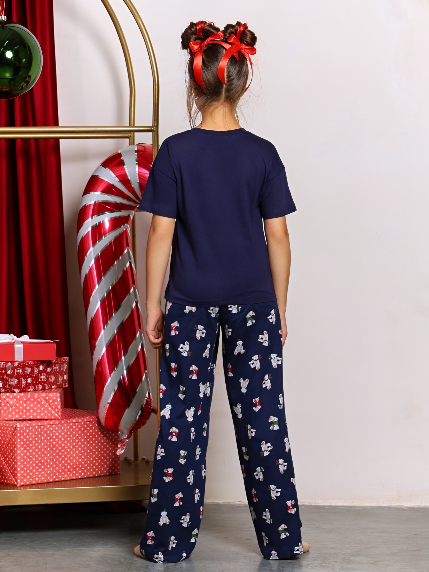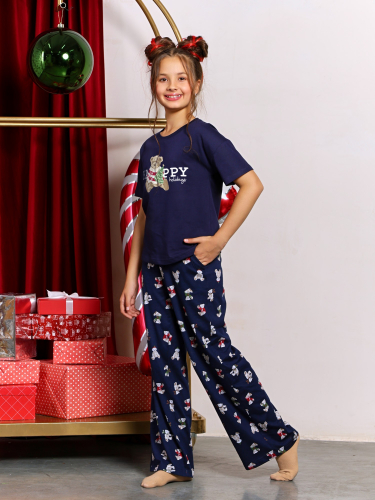 Костюм для девочки из трикотажного полотна "кулирка" в комбинации двух видов: гладкокрашеного и набивного с тематическим рисунком, состоящий из футболки и брюк. Футболка из гладкокрашеного полотна, классического покроя, с коротким втачными рукавами, горловиной овальной формы, обработанной втачной планкой и отделочной строчкой. В центре переда - принт, выполненгный в технике шелкографии. Брюки из полотна с набивным рисунком длинные, прямые, на притачном поясе с эластичной тесьмой внутри и карманами в боковыых швах.